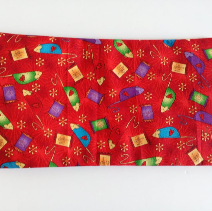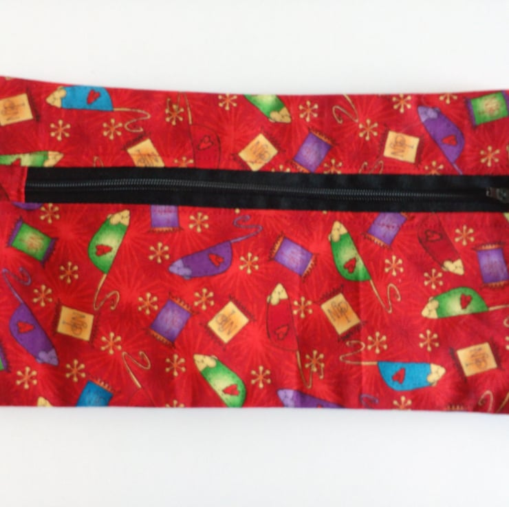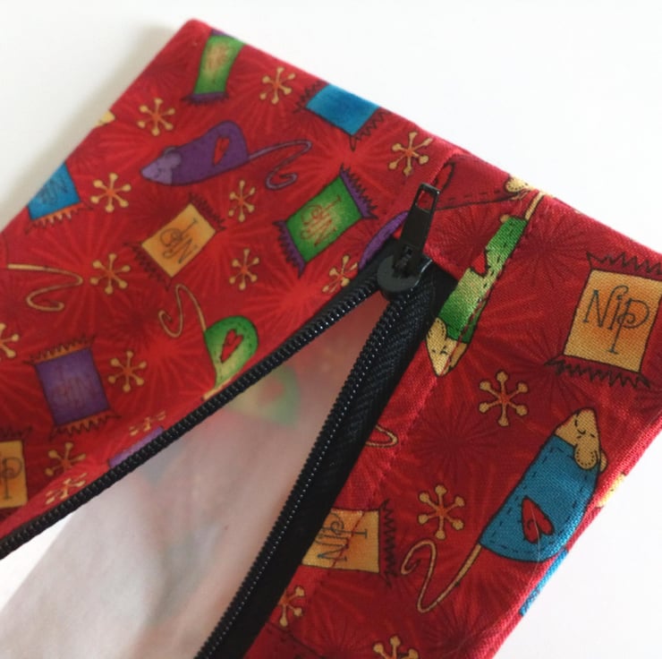 Red zipped cotton pencil case/ zipper pouch with mice on the fabric.