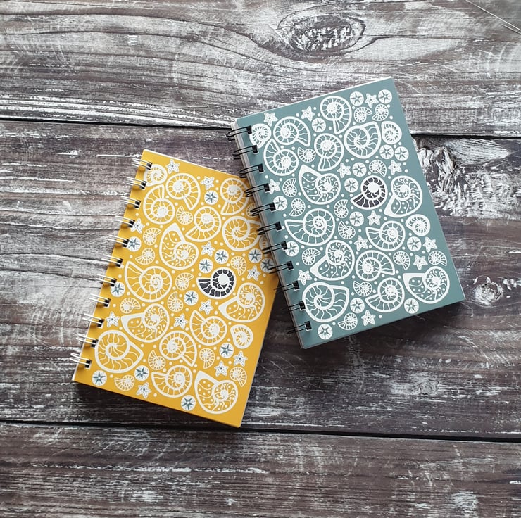 An A6 size hand-bound wire notebook featuring hand-drawn ammonites, crinoid stars and sea urchins.