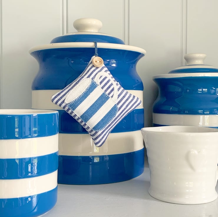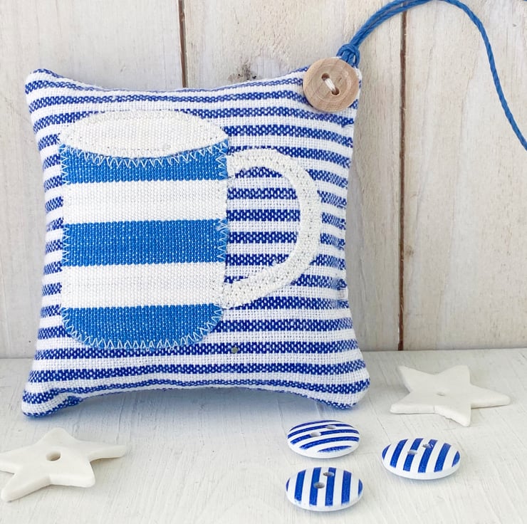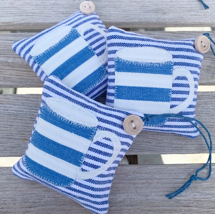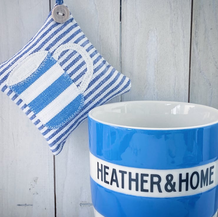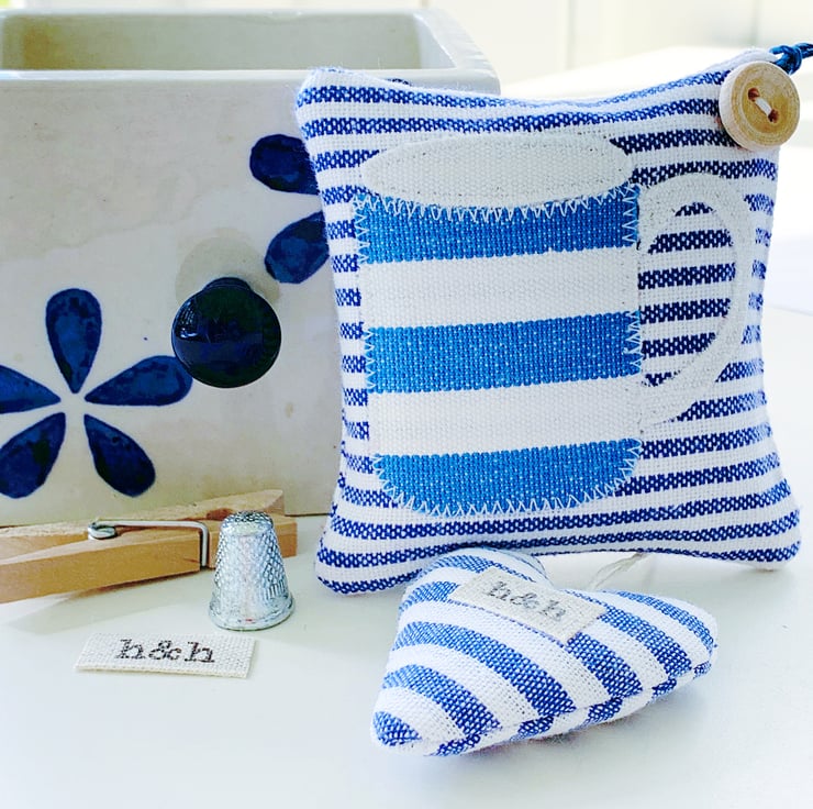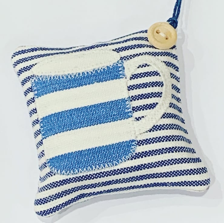 A blue and white striped mug appliquéd onto a fine-striped blue and white background. With a rustic wooden button in the corner and a blue hemp twine hanging loop, each mug sachet is generously filled with either fragrant and locally grown Hampshire lavender or toy-grade stuffing, and has little linen h&h label on the back.