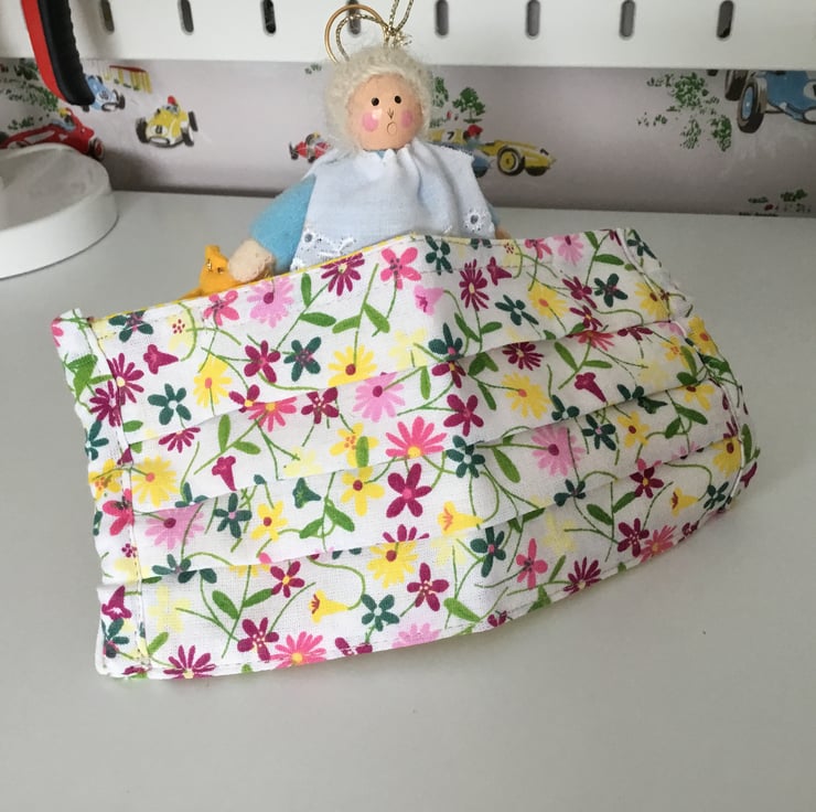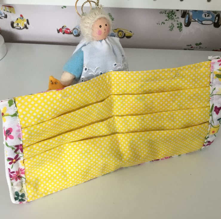 Colourful double fabric face covering with elastic ear loops and nose wire.