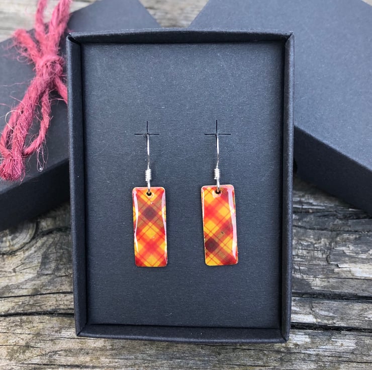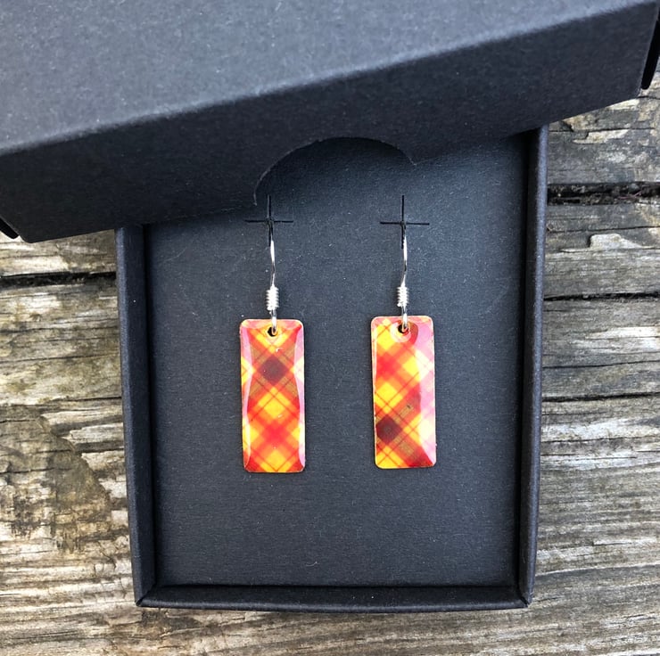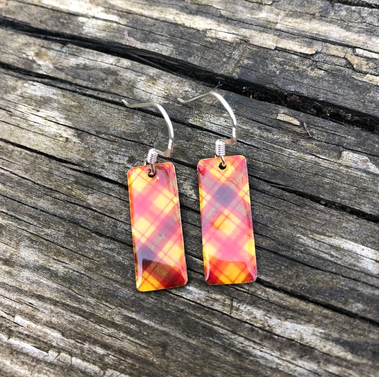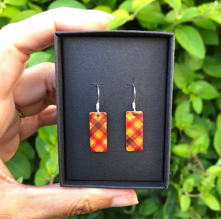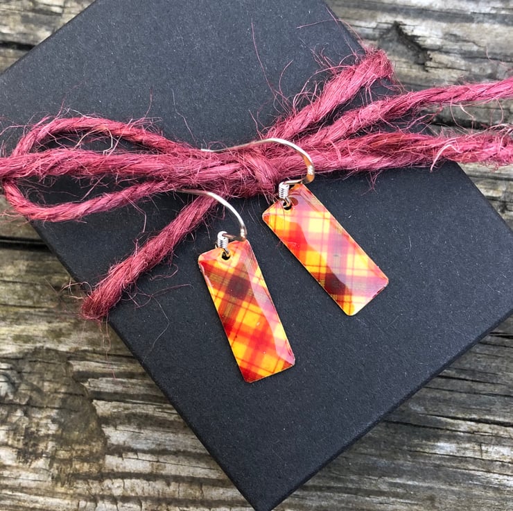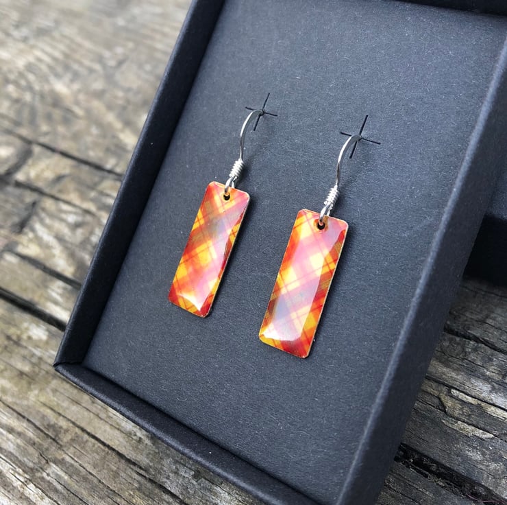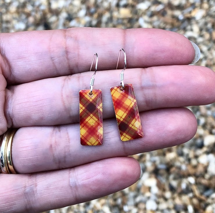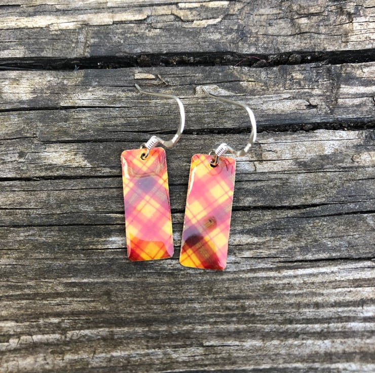 8x20mm silver tone metal charms have been hand decoupaged in a pretty paper and topped with cold enamel to give a lovely shiny glass finish. The charms hang from sterling silver earring wires.