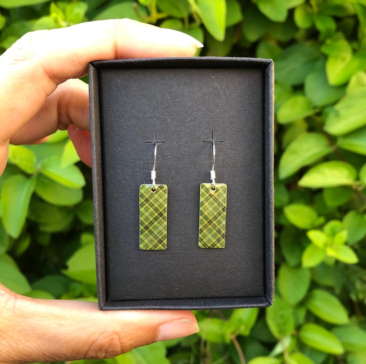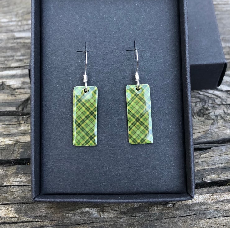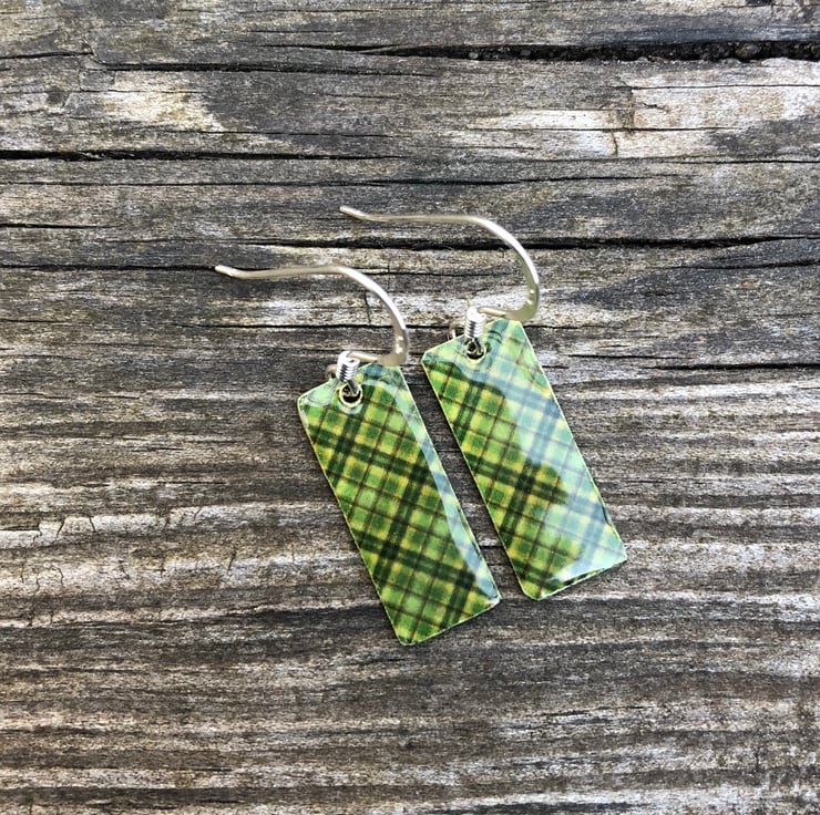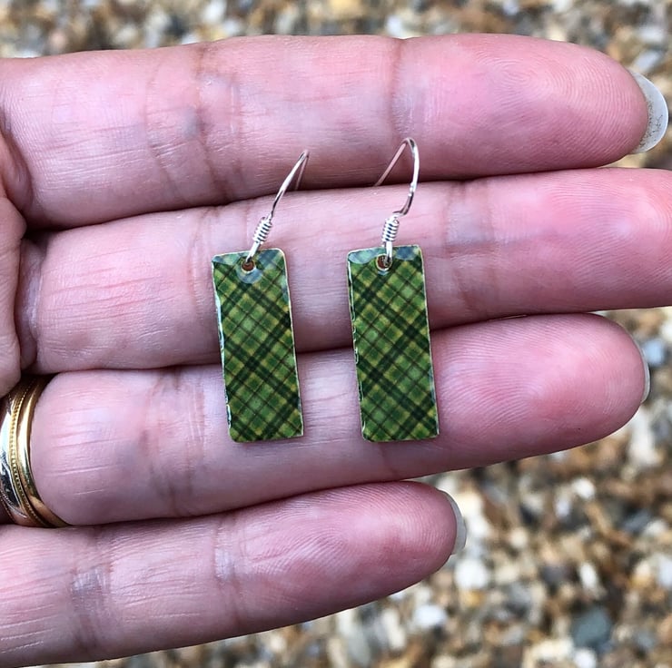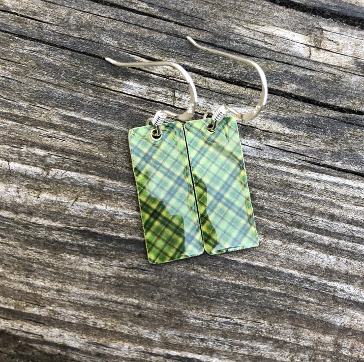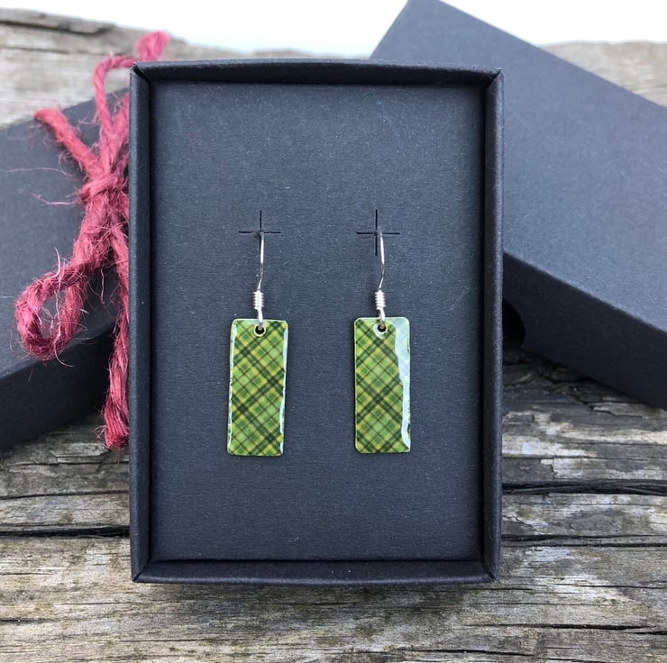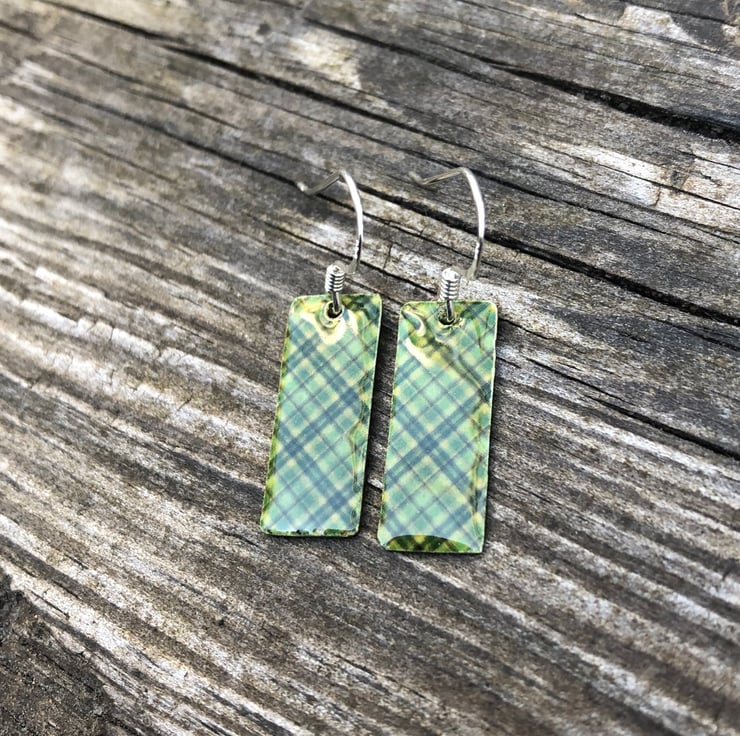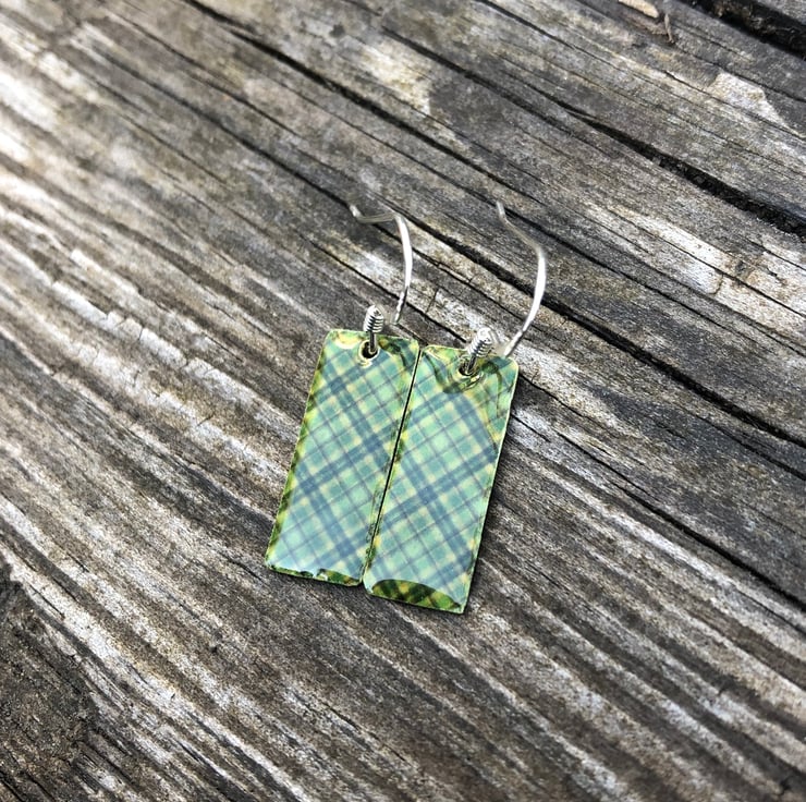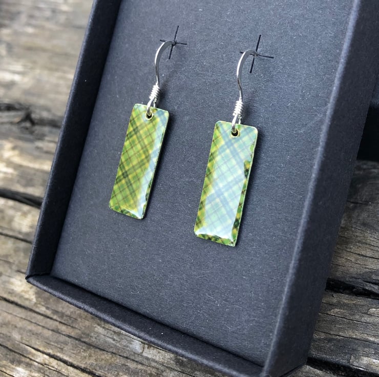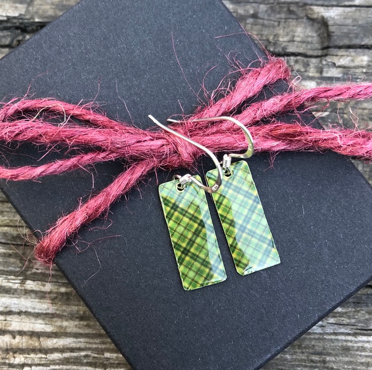 8x20mm silver tone metal charms have been hand decoupaged in a pretty paper and topped with cold enamel to give a lovely shiny glass finish. The charms hang from sterling silver earring wires.