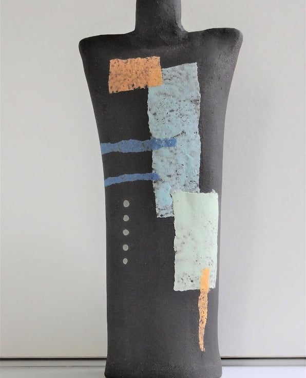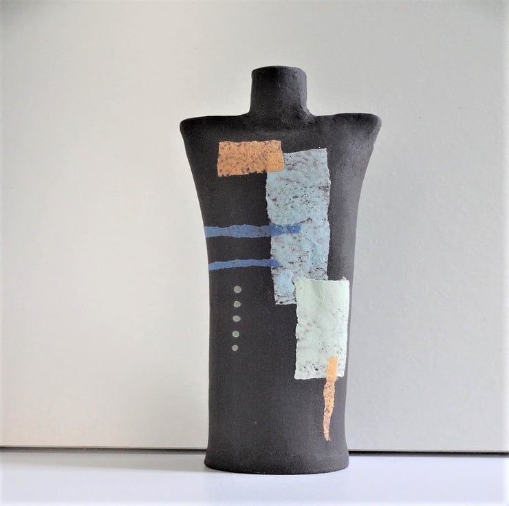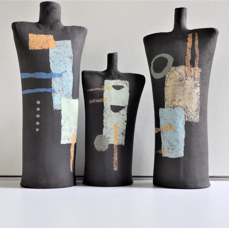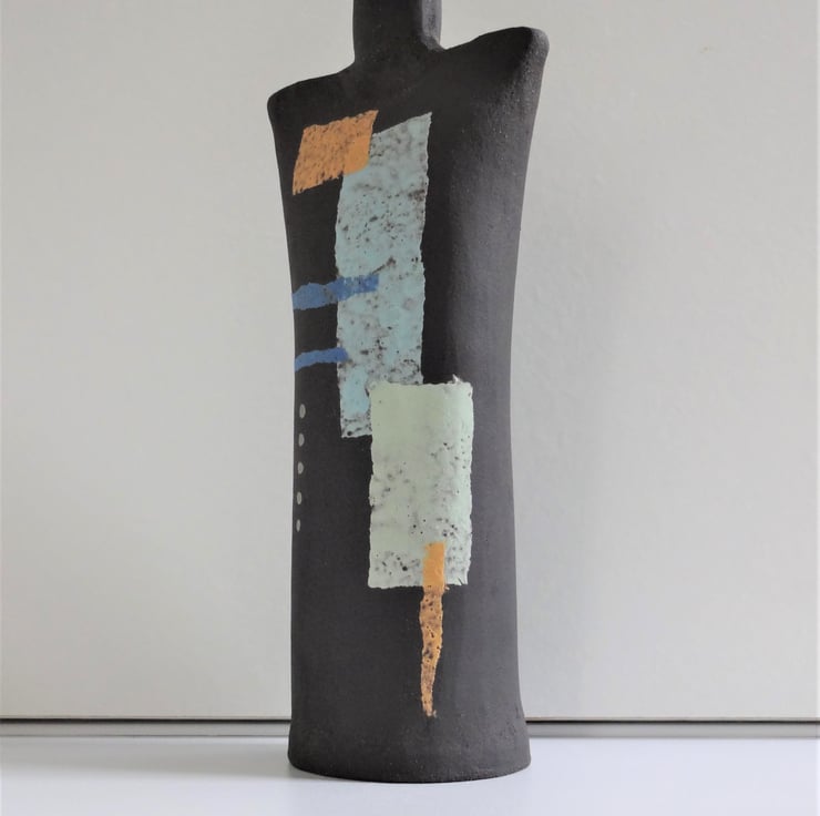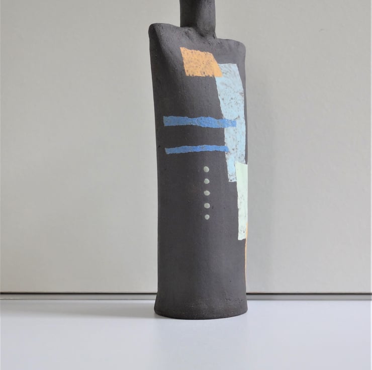 The pastel shades of Blake’s decorative motif will harmonise with most contemporary colour schemes in your rooms. I have used a combination of abstract rectangles, stripes and dots applied with a natural sponge and brush and these are fired into the piece. Blake is part of the Kindred Collection, a family of handmade black stoneware pieces, each one with its own distinctive shape, decoration and personality. Blake, at 16.5 cms tall, is a smart stand alone piece, or he looks good as part of a ‘family group’ of different sizes – one of the images shows Blake with some friends! The simple figurative form and abstract decoration can make a contemplative focal point for yoga/mindfulness meditation. On the base you’ll find my potter's mark of a swallow in flight.
