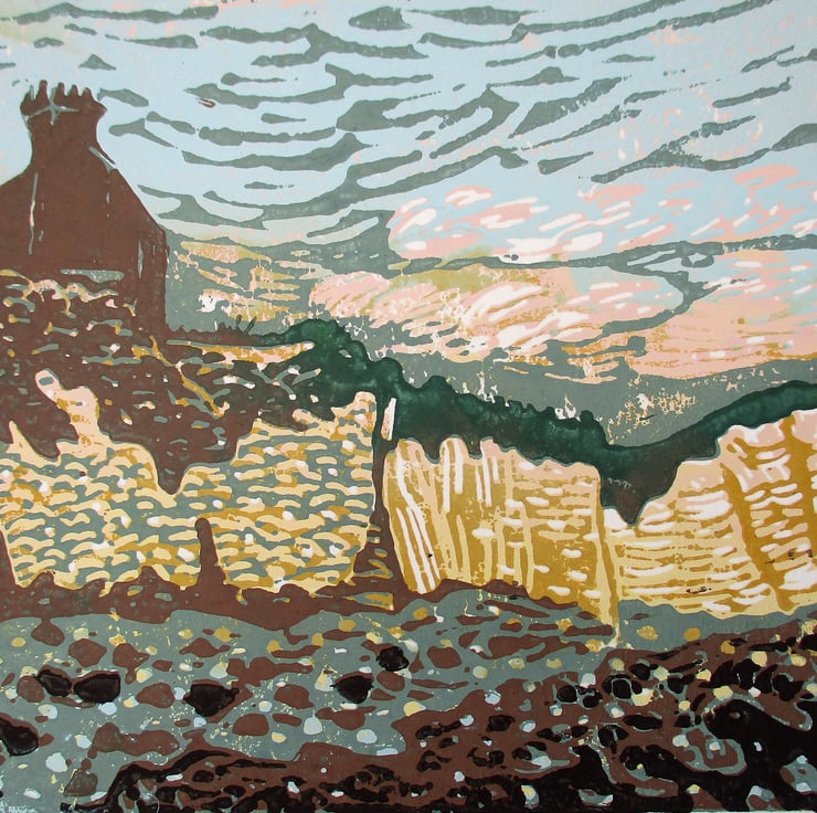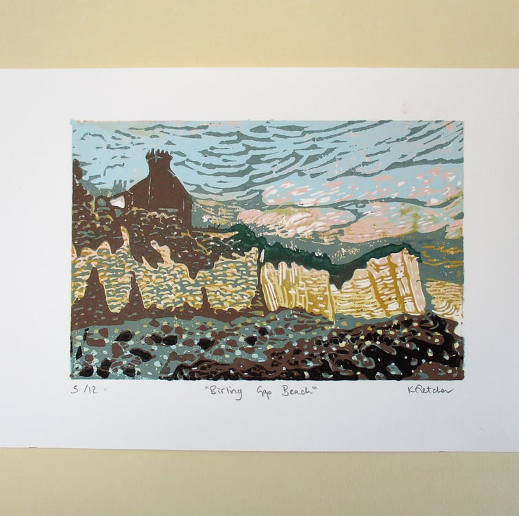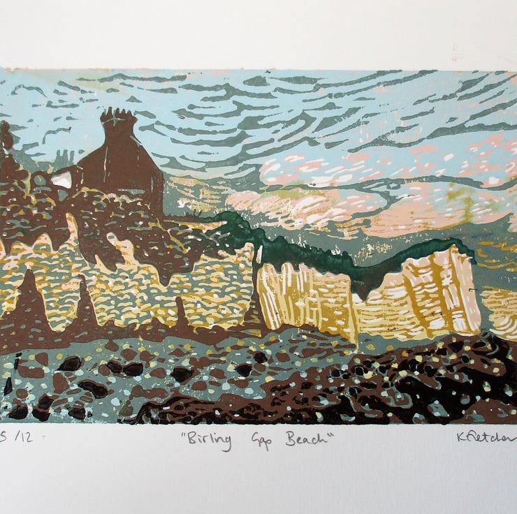This original hand pressed linocut print is based on photographs I took at the shingle beach below the chalk cliffs at Birling Gap, East Sussex.
