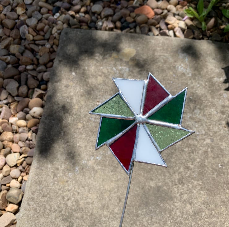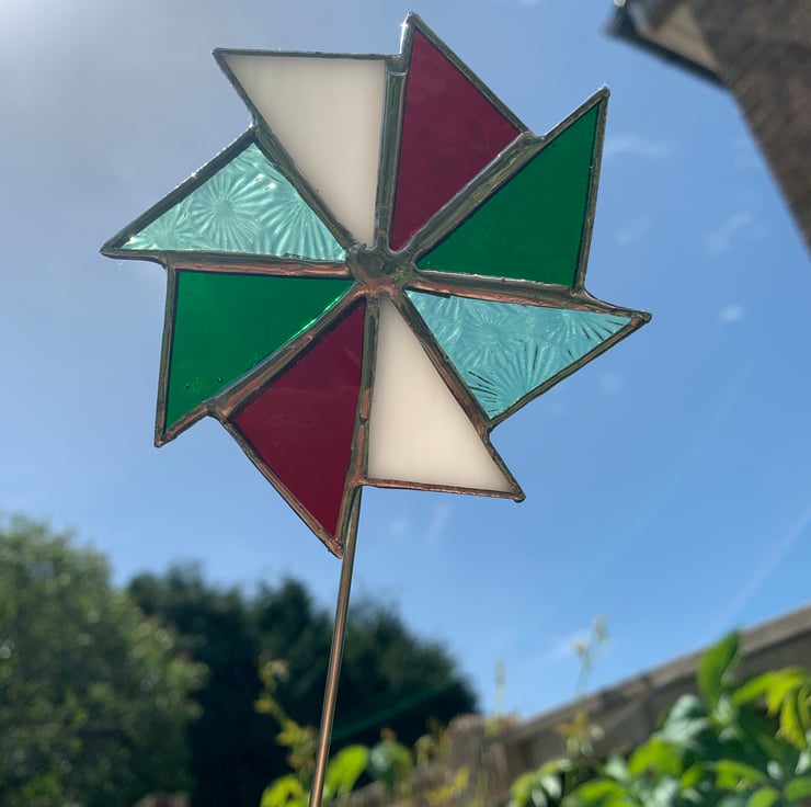 The glass used for this windmill is a mix of white opaque glass, light green florentine glass, green sea glass and red corella glass.