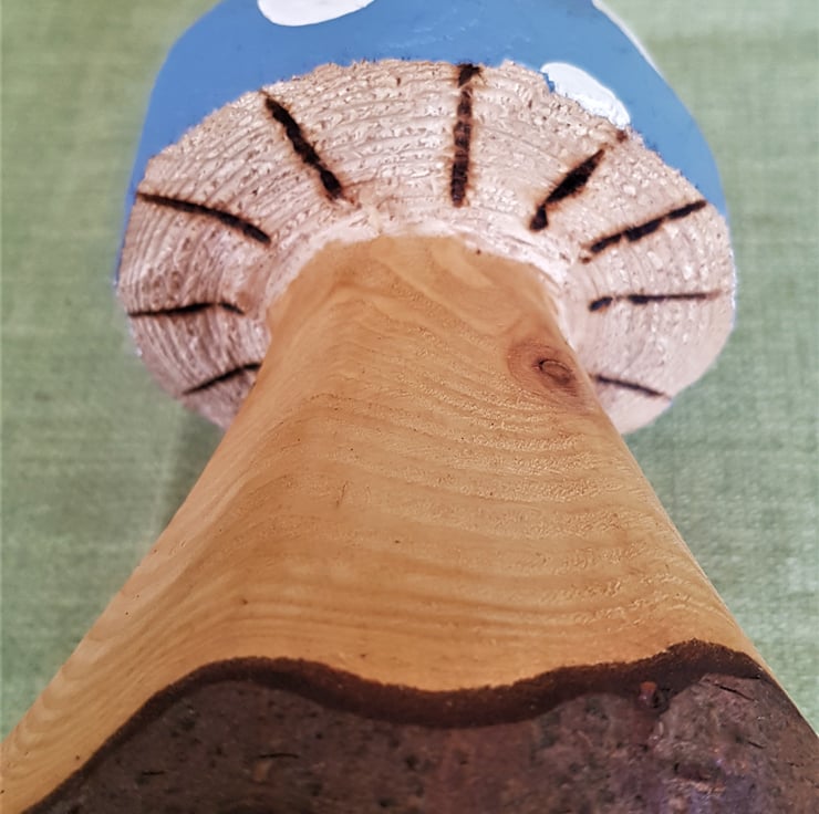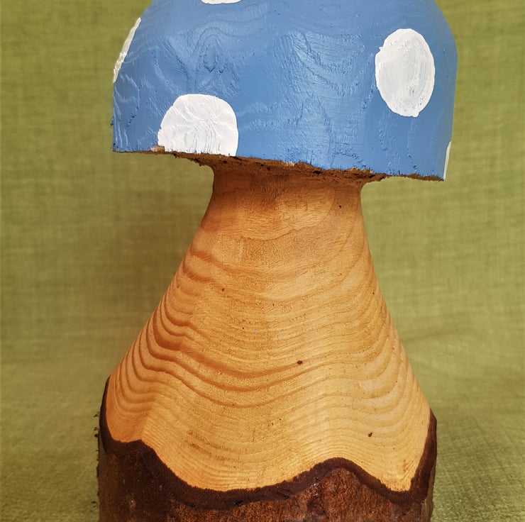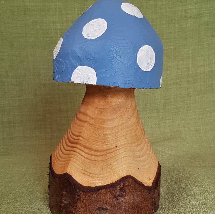 This blue spotty toadstool is carved from Douglas Fir and makes a pretty and unusual ornament for your garden! It is one piece of wood and has been chainsaw carved then sanded. The spotty top is decorated with weatherproof paint.