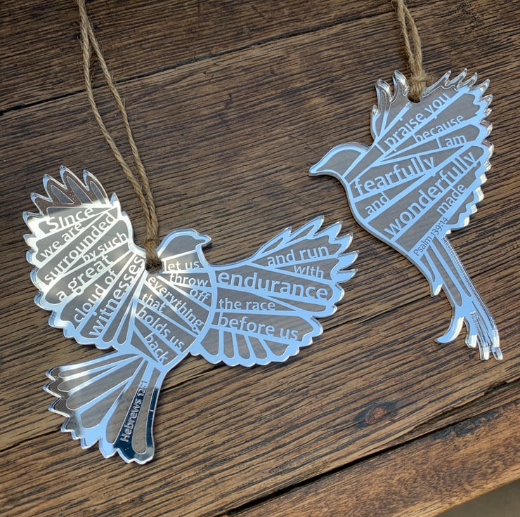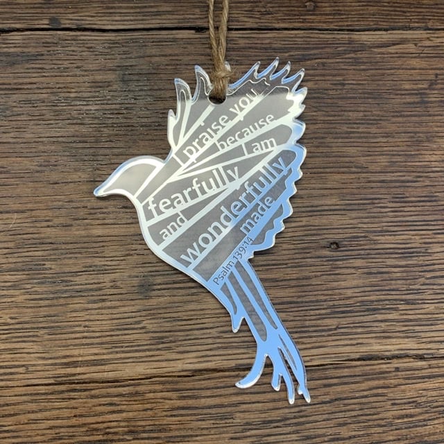 I reverse-etch my design onto the back of a sheet of mirrored acrylic, laser cut them out and attach twine. The text reads: