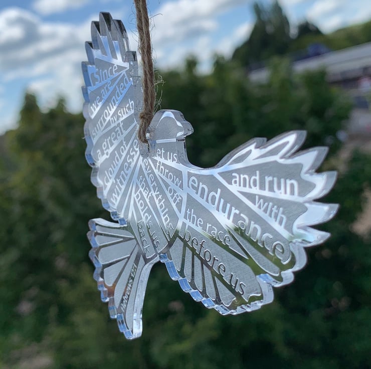 A laser-etched bird that can be hung indoors or outdoors as an eye-catching garden decoration.