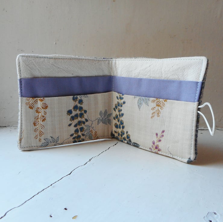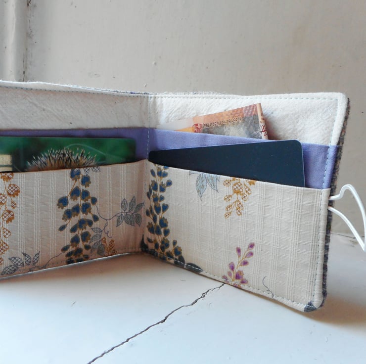 Internally it is constructed from ivory cotton muslin, with cotton quilting fabric pockets in soft beige and lilac. The four pockets are perfectly sized for credit or debit cards, but notes will have to be folded.