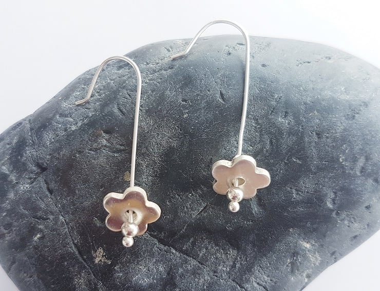 1.5" long sterling silver bar earrings, with a fine silver flower separated by two sterling silver beads.