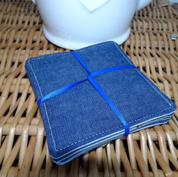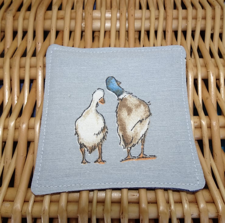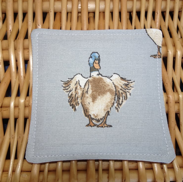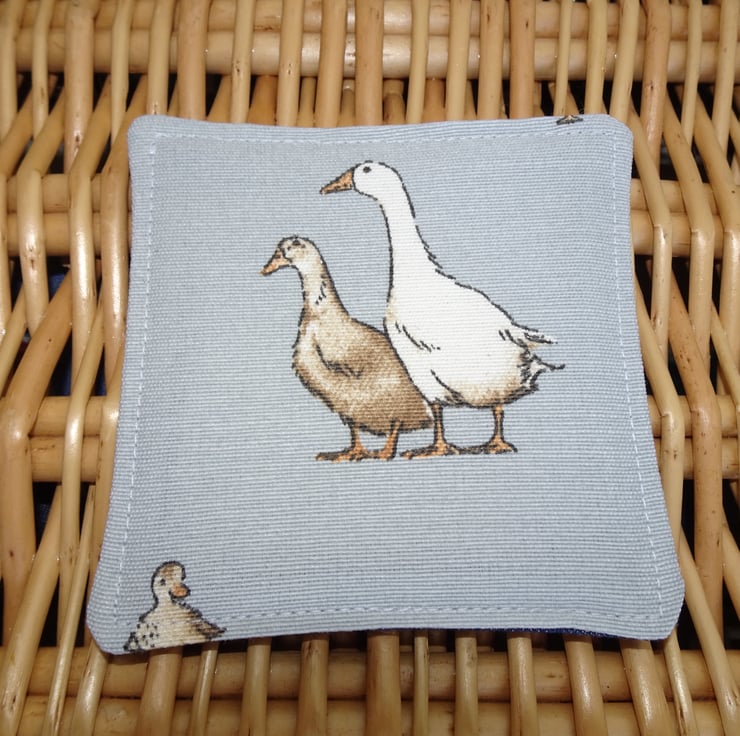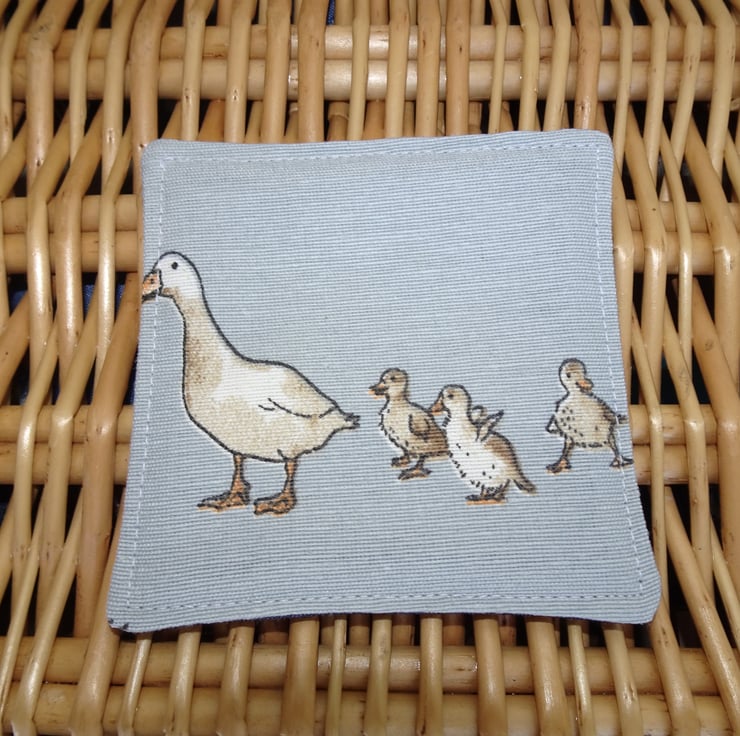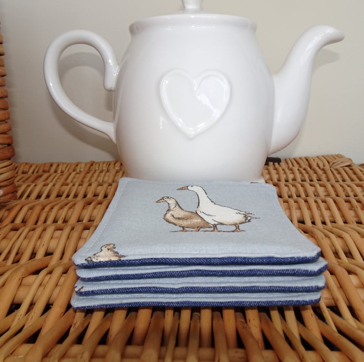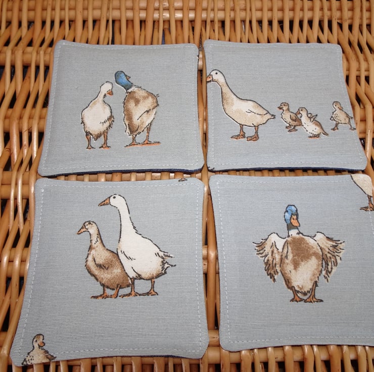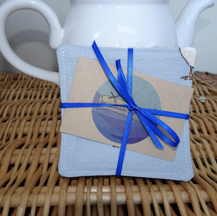 A set of 4, fabric, duck print coasters, on a lovely duck egg blue background, to liven up any tea time. No more cups sticking to the bottom of hard coasters! These coasters measure approximately 90mm by 90mm (9cm by 9cm) and consist of three layers; the main fabric, a thin layer of wadding inside and a lining of a denim look, thin cotton. This makes them soft and tactile to the touch. Can also be used to stand pot plants on or other items where you want to protect surfaces. The 4 coasters are bound together with gift ribbon measuring 750mm (75cm) in royal blue.