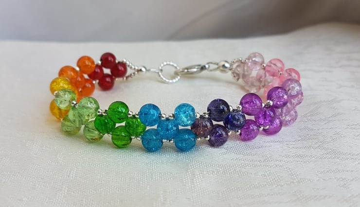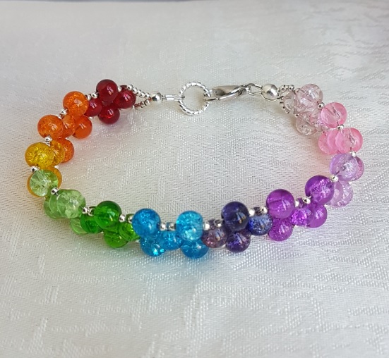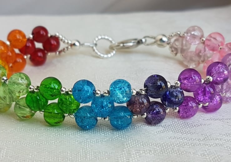 Gorgeous Rainbow spectrum cuff bracelet. Fabulous glass beads in a whole rainbow of colours plus more. Gorgeous as a gift to brighten up any season. A great piece of colourful jewellery.