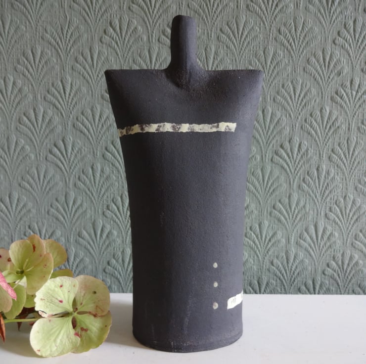 The lines, dots and stripes of the design on this abstract ceramic piece (called Jenna) are in shades of sage green, lemon and grey, contrasting with the matt black stoneware clay background. The front features a central panel of green, with twining lines revealing the black clay beneath, set off by pale yellow stripes and a series of dots. The design continues around the back of the piece so that the form is interesting whichever way you view it! Jenna can stand alone as a piece of sculptural ceramic, or can form a ‘family group’ with other pieces from the Kindred collection (see images). Kindred pieces can also form a quiet focal point for meditative practices such as yoga or mindfulness. Jenna is 17.5 cms high and 6.5 cms at the widest part of the oval base.