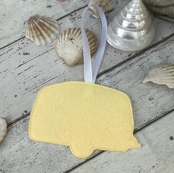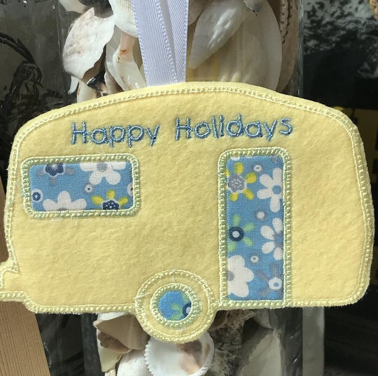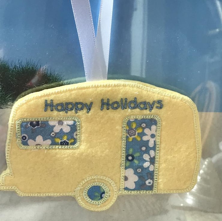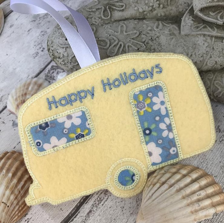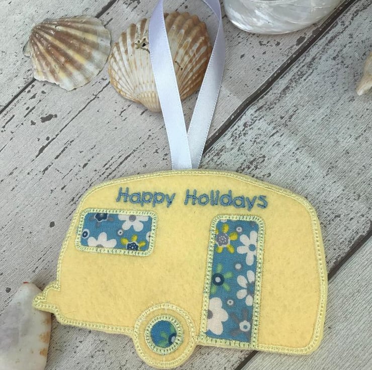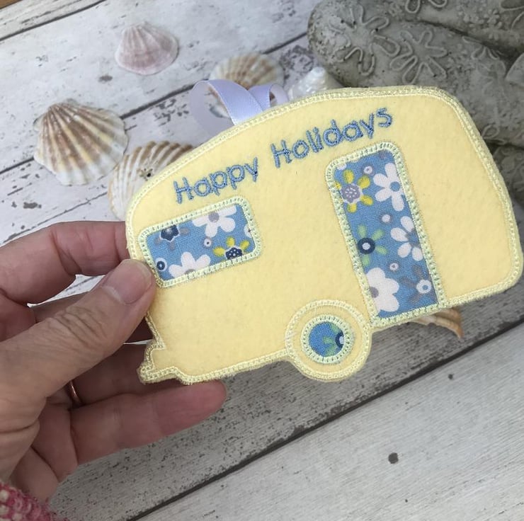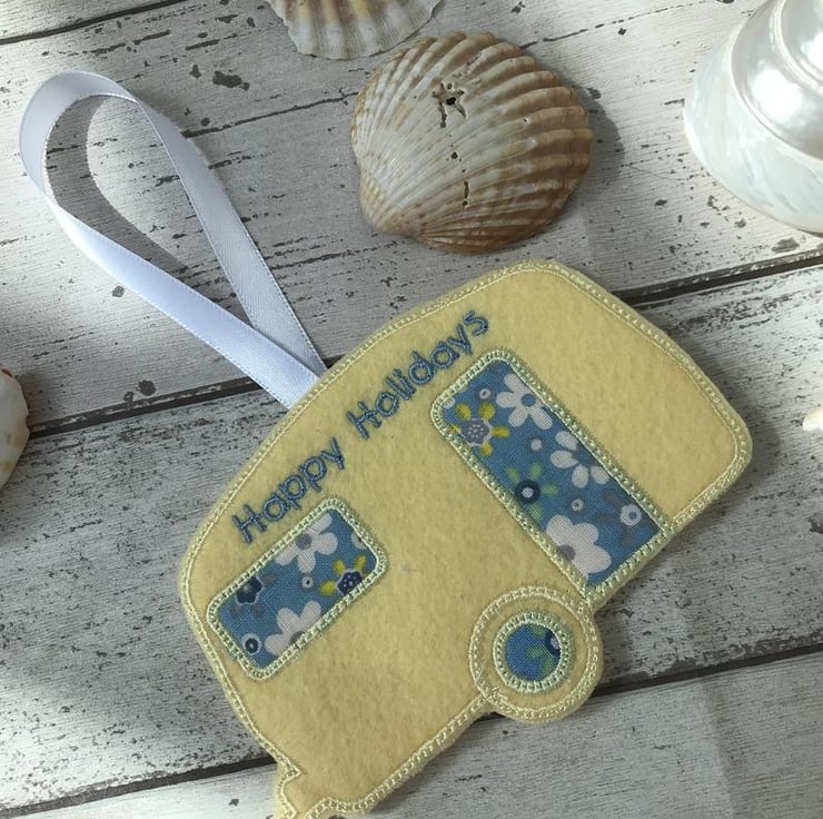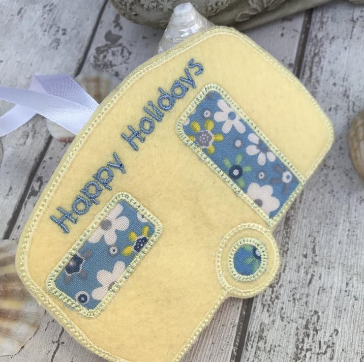 A fun sending gift for anyone missing their caravan. This caravan is made with pale yellow felt and cottage chic look fabric. In a 80s design era of caravanning. With blue words Happy Holidays.
