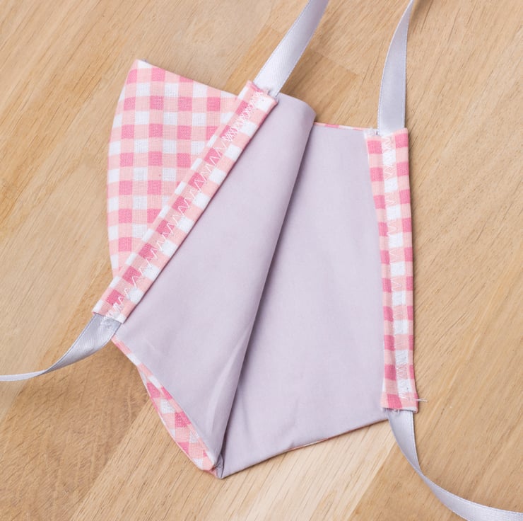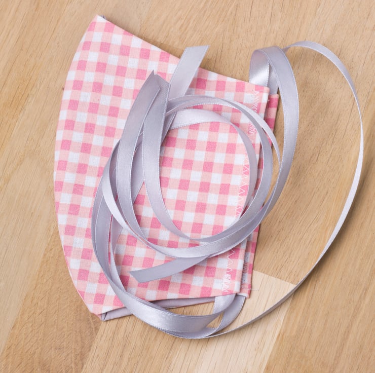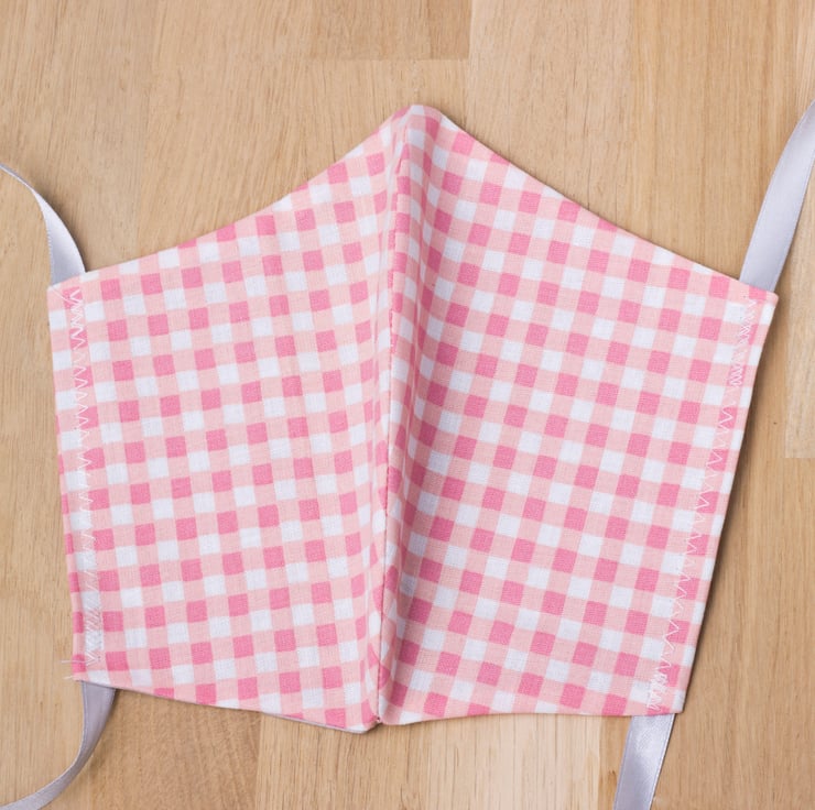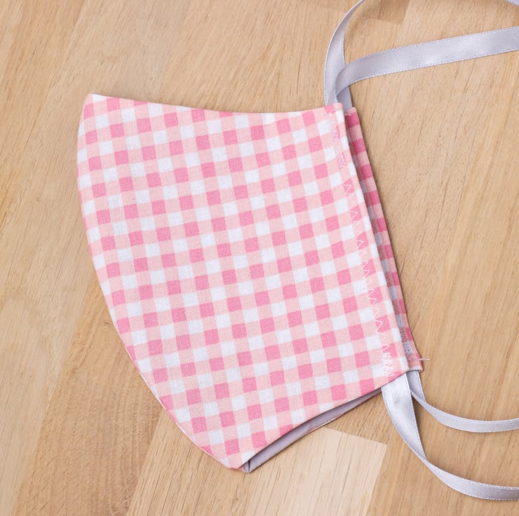 This face mask is made with two layers of cotton featuring a pink gingham pattern on the outside and light grey plain fabric on the inside. The face-covering shape fits nicely around your chin and over your nose. It fastens with grey ribbon ties which allow you to get a good fit. Ribbon does not degrade like elastic when washed and can be tied either straight or criss-cross. Ties do not hurt your ears like elastic ear loops do, allowing you to wear the mask for longer periods of time. There is a generous amount of ribbon so you can cut off whatever is not needed once you determine the fit.