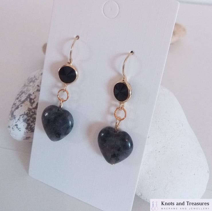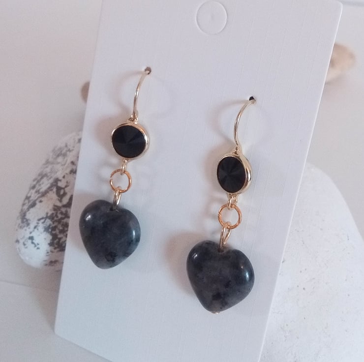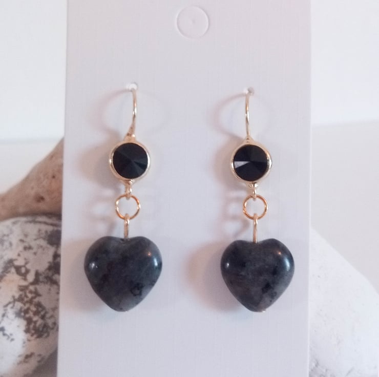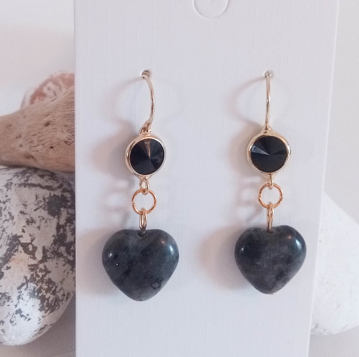 Beautiful labradorite heart stones hanging from golden tone brass earrings hooks with black glass. The approximate sizes of the heart stones are15mm