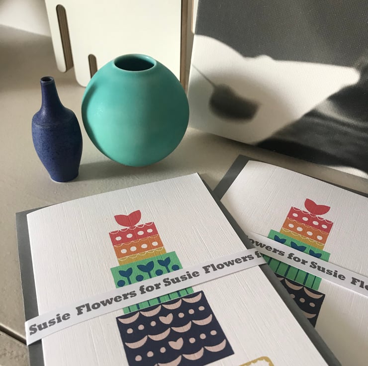 Inspired by Scandinavian patterns this beautiful rainbow wedding cake card is perfect for anniversaries and weddings alike. The striking array of rainbow colours across the simple soft graphic pattern give this design a feeling of hope and expectation. A high quality inkjet print on 260gsm premium quality linen textured white card this A6 card also comes with a beautiful steel grey envelope. The cards and envelopes are bound by a simple paper band making the cards and their packaging totally recyclable.