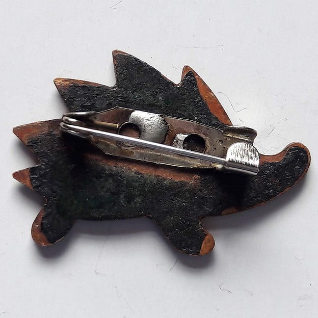 This hedgehog measures 30mm, nose to tail, 21mm tall. I have soldered a 20mm brooch bar to the reverse. I was unable to source a brooch bar with a rotating catch to fit the hedgehog. You can see the simple catch I've used, on the second picture.