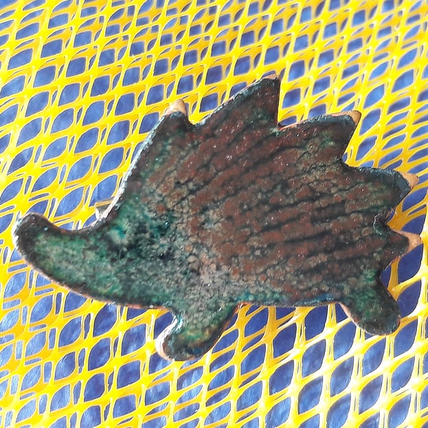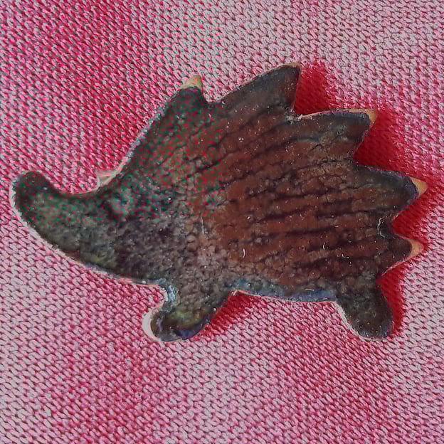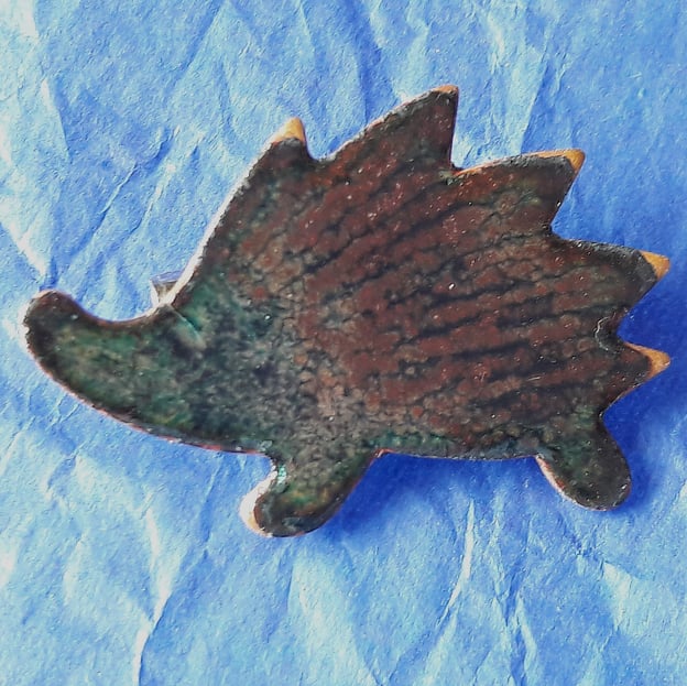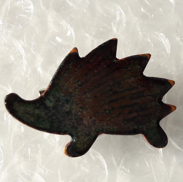 I have built up several layers of clear enamel on the copper base then added first a layer of black then a layer of chestnut brown on the hegehog's back. I have drawn through these layers before firing to add features, that show through, the eye and the spines.
