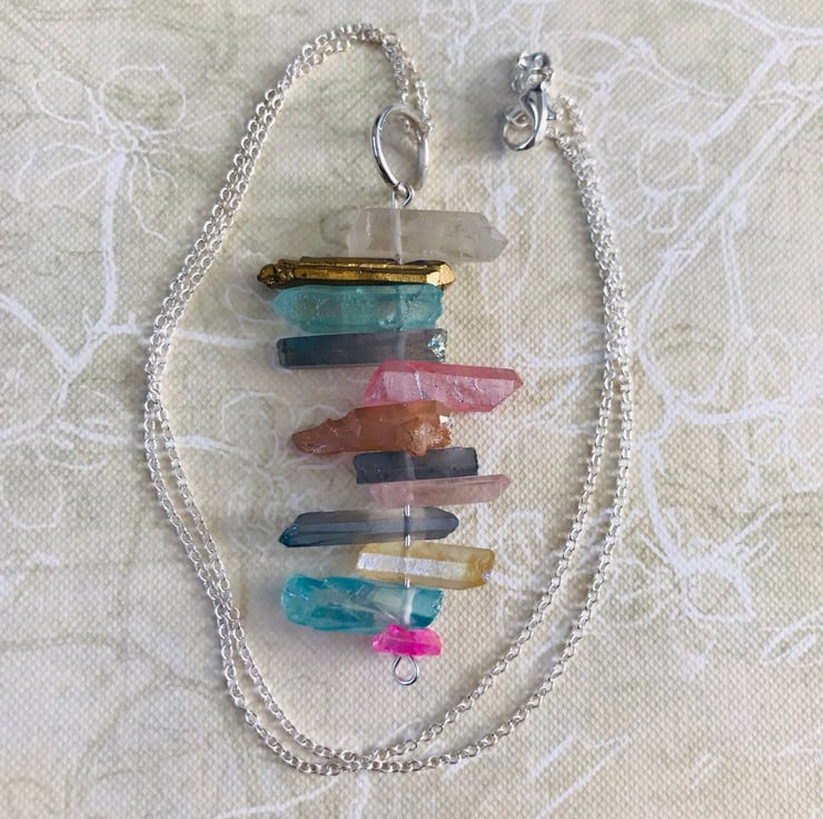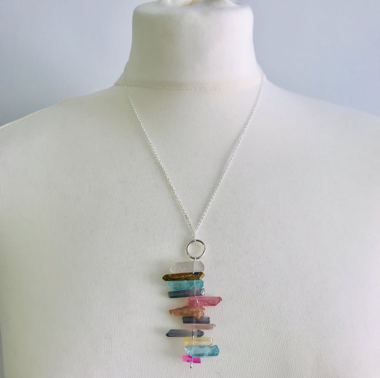 Multicolour ,irregular ,gemstone, statement Necklace. Pendant measures approx 7cms. Hangs on a 20 inch chain with lobster clasp.