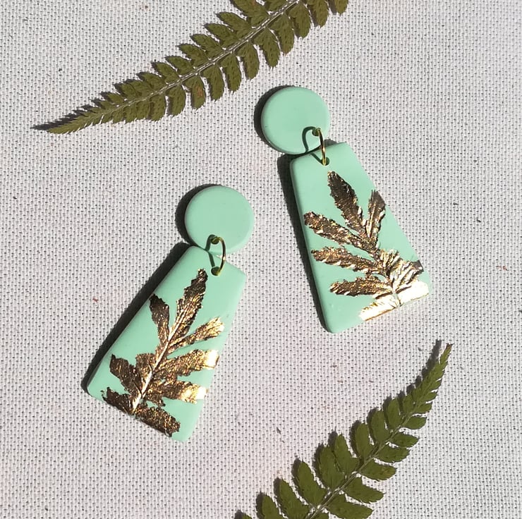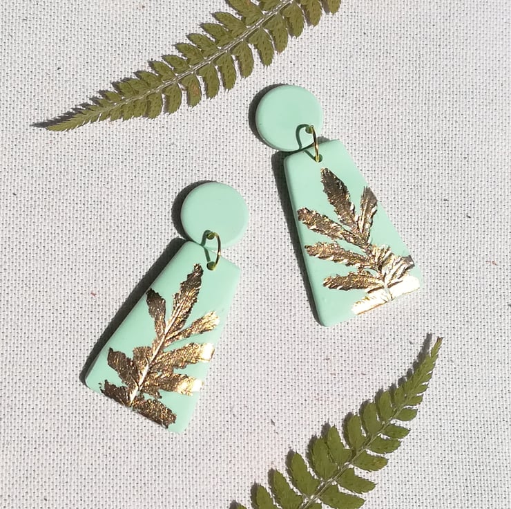 These striking trapezoid shaped earrings are hand made using mint polymer clay with a real leaf imprinted on to the surface. They are part of my collection of Botanic metallics. They have then been carefully gilded with genuine gold leaf and finished with a gold plated jump ring and silver plated stud.