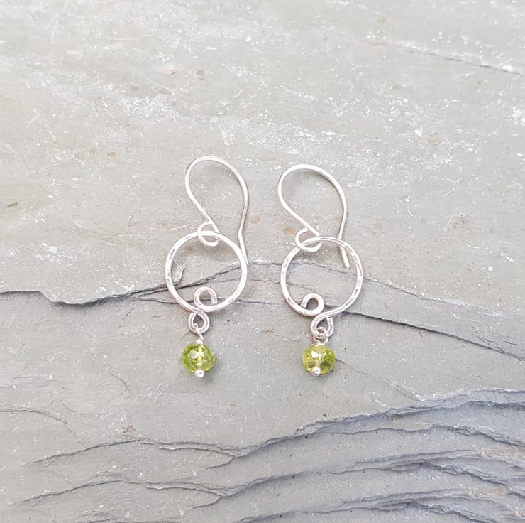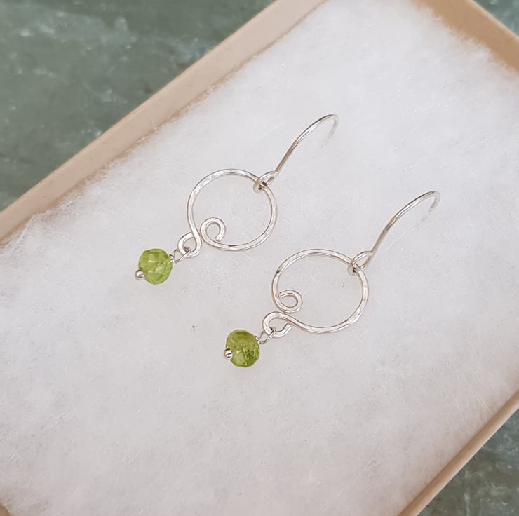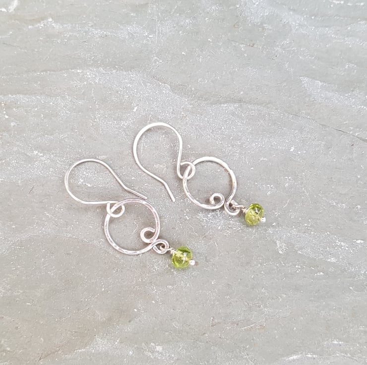 I have hand formed these dainty earrings using sterling silver wire and added a faceted peridot at the bottom. The earrings hang from handmade sterling silver ear wires.