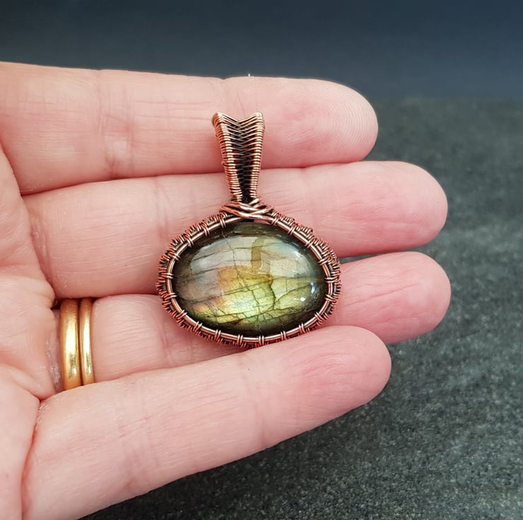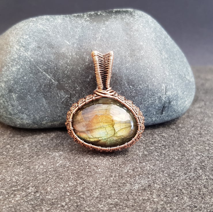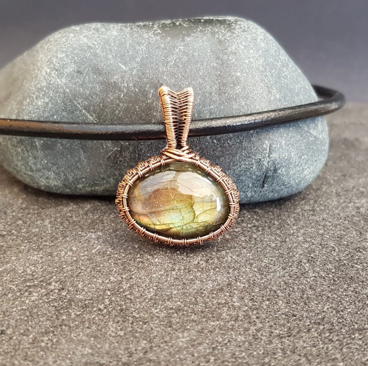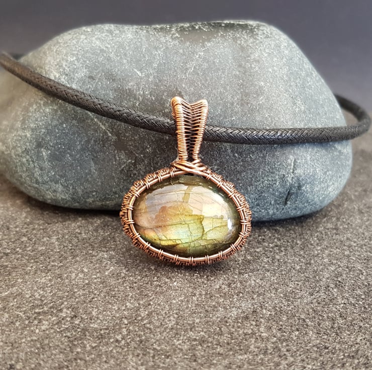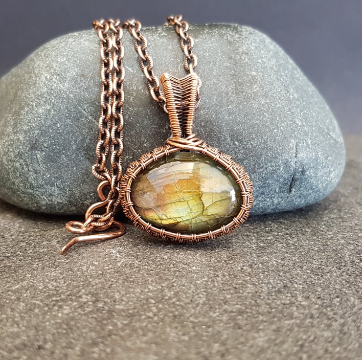 I have hand woven around this lovely labradorite using solid copper wire to make this dainty pendant.