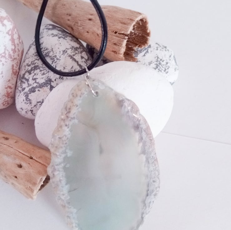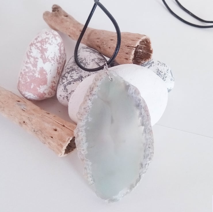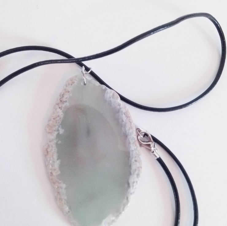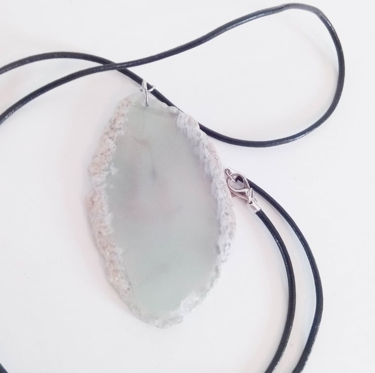 This quartz slab pendant is approximately 70mm in size and hangs from black leather cord of approximately 30 inches in length