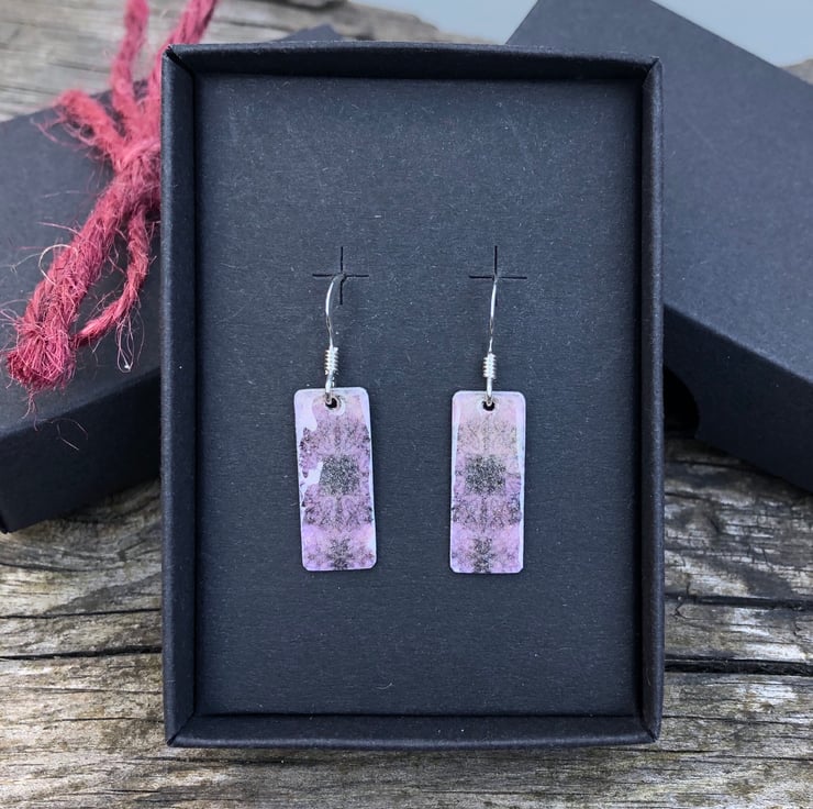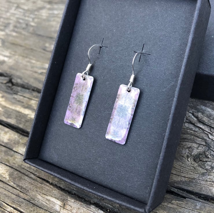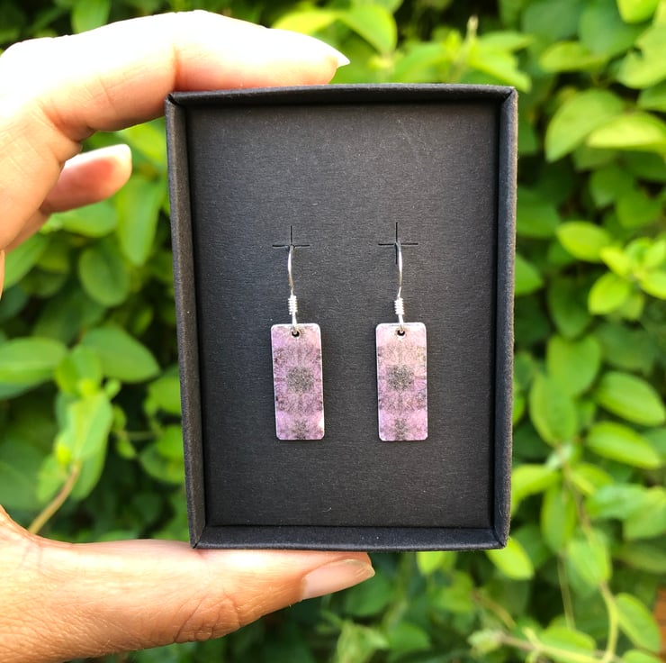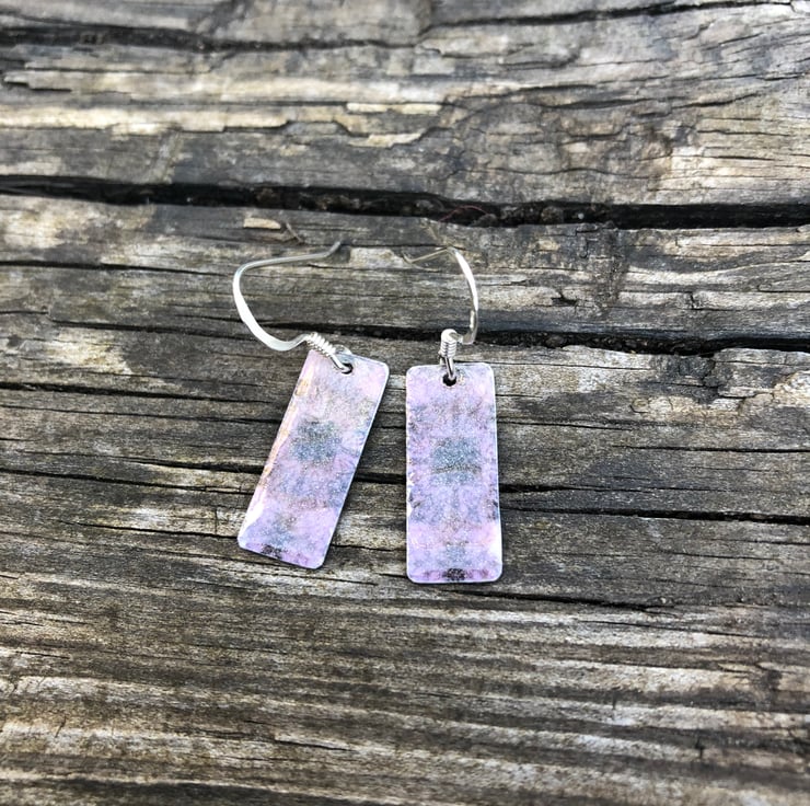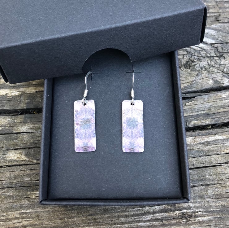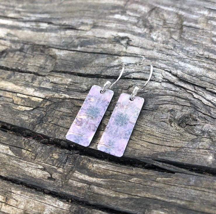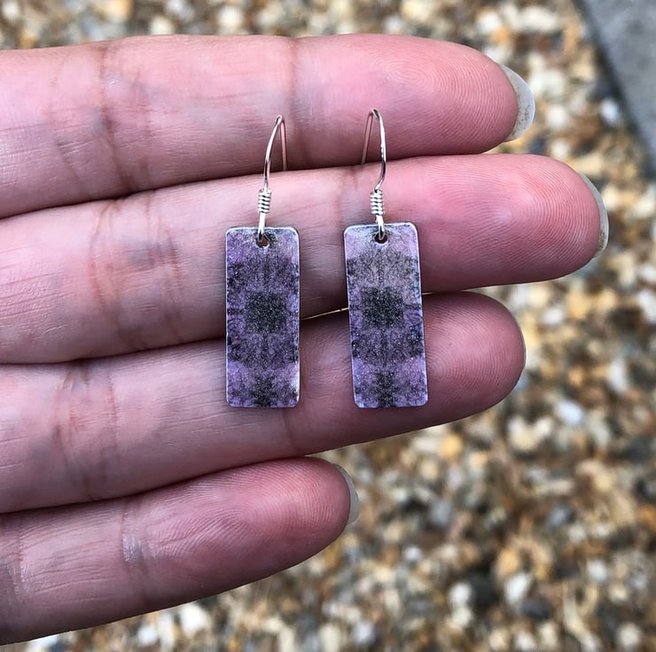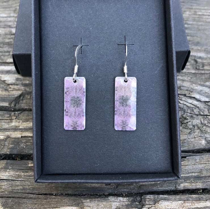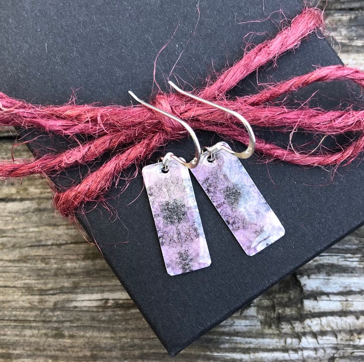Lilac Decoupage & Enamel Rectangle Earrings. Sterling silver.