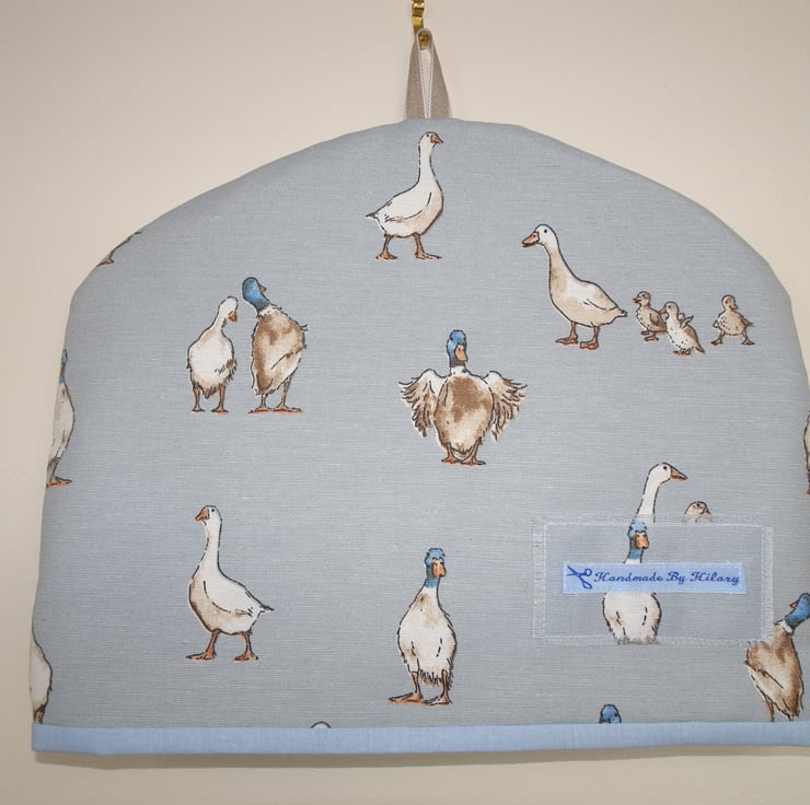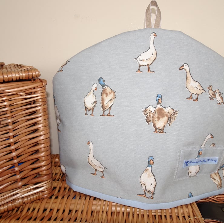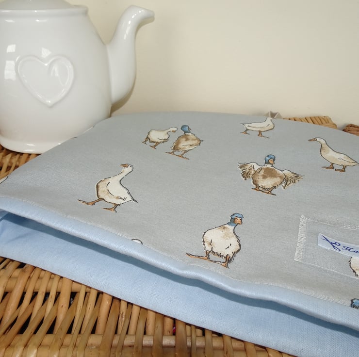 This super cute ducks fabric tea cosy would look great on any kitchen table or coffee table. Made from a cotton main fabric with a wadding inside and a pretty blue inside lining, it measures approximately 32cm wide by 26cm height. Suitable for a medium to large teapot. Matching coasters in a set of 4 are available.