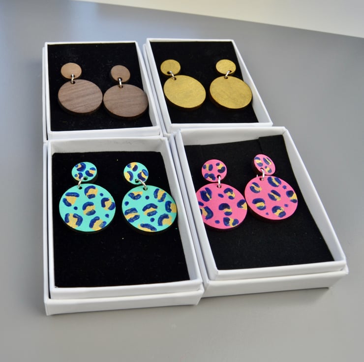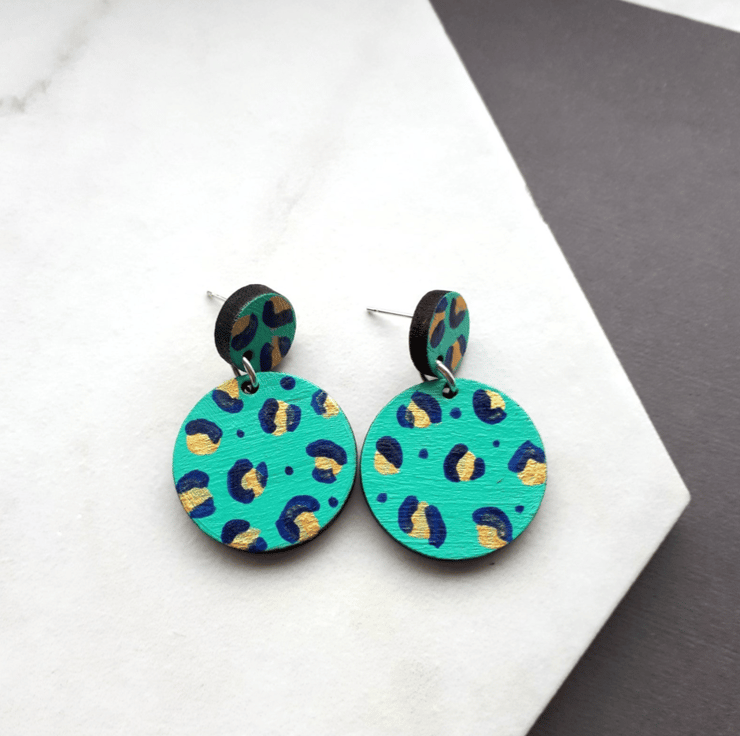 The front has been hand painted in aqua, or pink, with a leopard print pattern in gold and navy and then varnished to protect them. The back is the natural walnut wood colour.