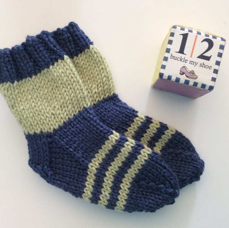 I knitted these on a blowy rainy afternoon. I really like the green/ blue colour combination. I can just imagine a tiny pair of feet inside them.