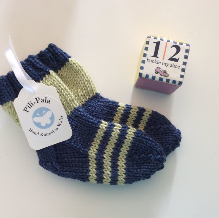 These soft little socks were hand knitted by me. They are knitted in a cashmere blend wool that is soft for babies feet but can also be machine washed at 30 degrees. They are for age 3-6 months.