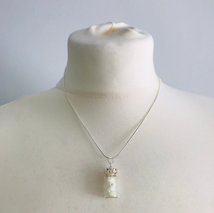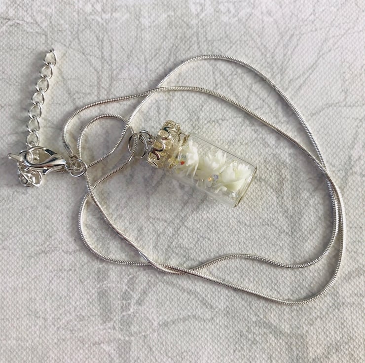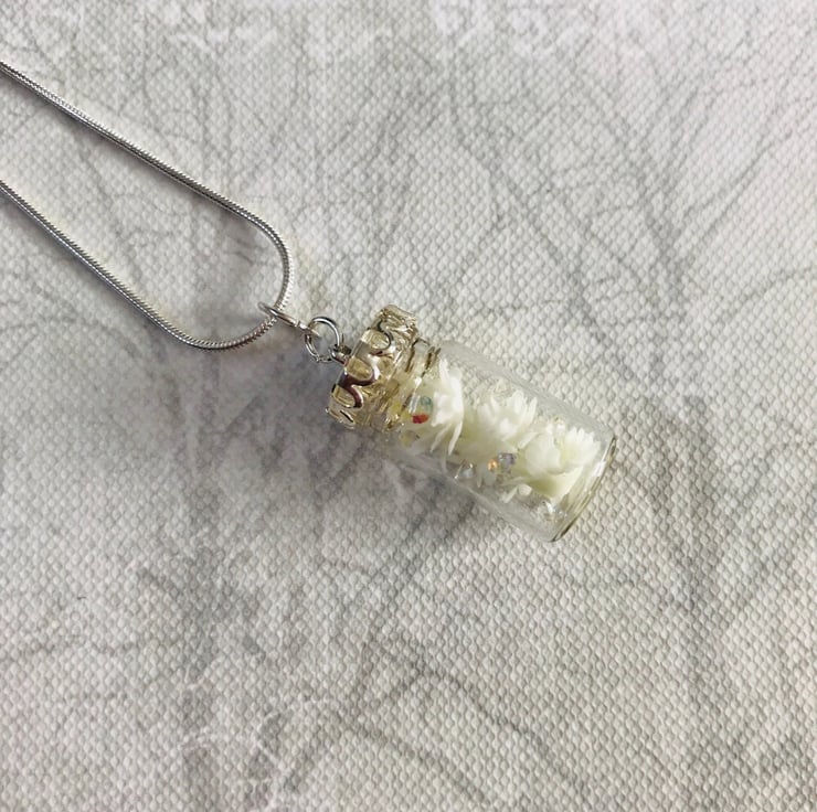 Jam jar vial necklace with encased flowers & crystals. Hangs on an 18 inch chain with lobster clasp.