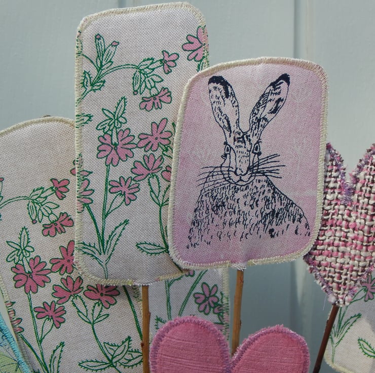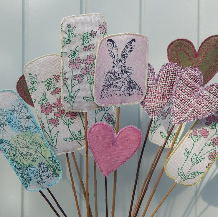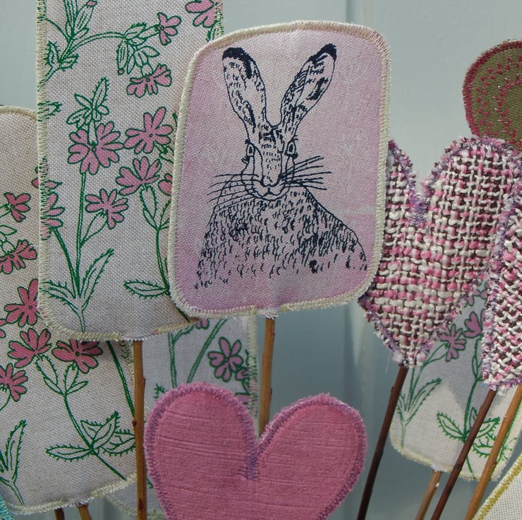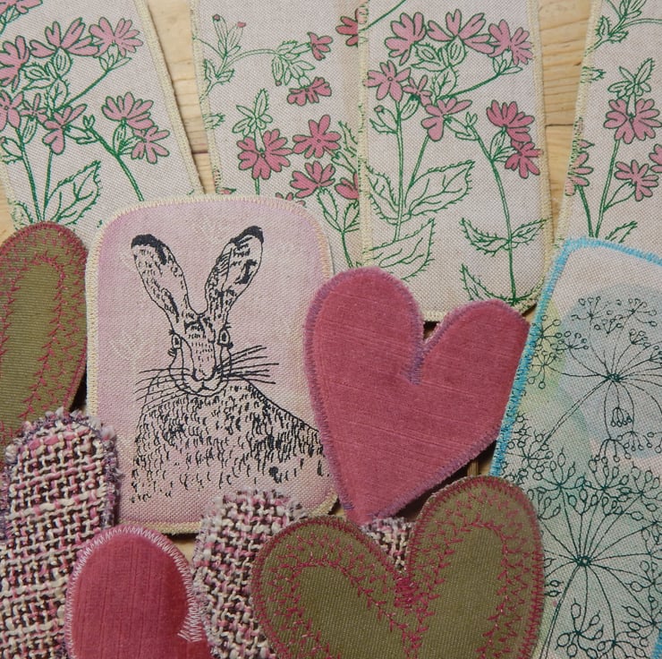 There are is 1 hare screen printed onto a simple ink lino print, 5 red campion double sided flowers, 1 cow parsley screen printed, 2 velvet pink hearts, 2 pink woven design hearts and 2 green denim hearts with pink decorative stitching. The red campion flowers are hand painted in pink to make them pop.