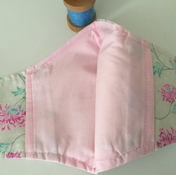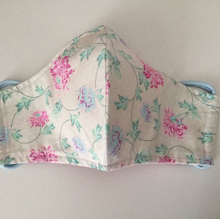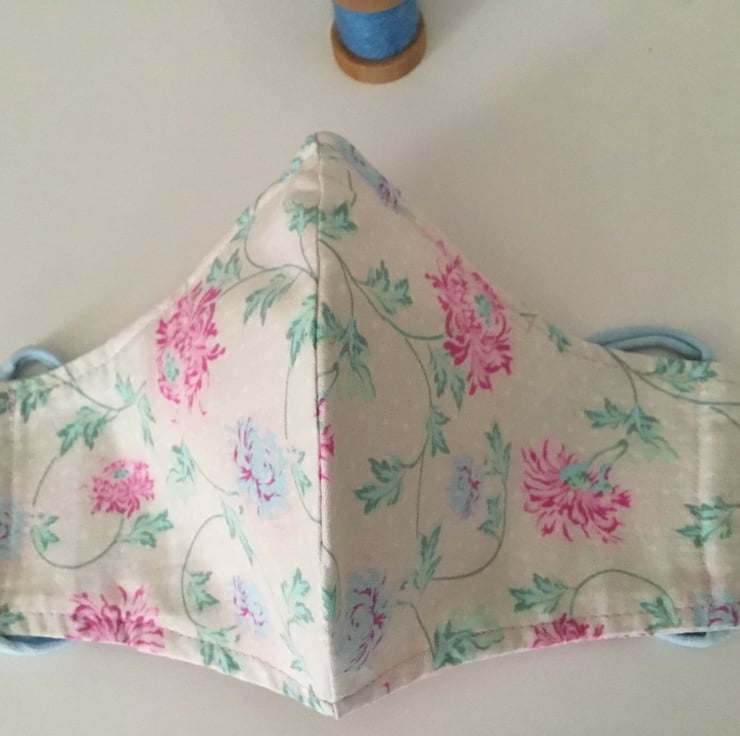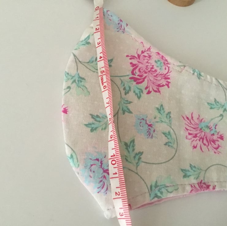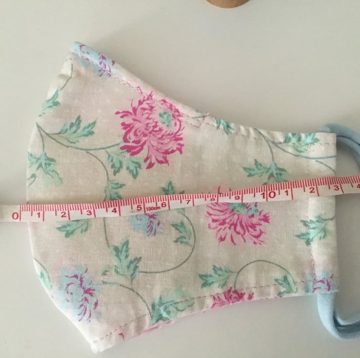 Face covering with elastic ear loops, nose wire and filter. This has been washed after making, see guidelines enclosed. Please see photo for measurements as this is non returnable.