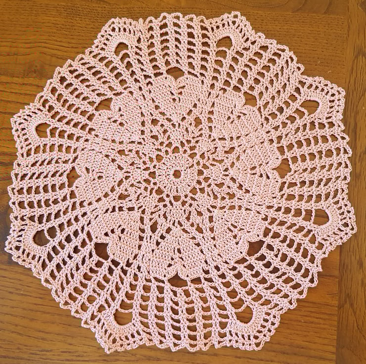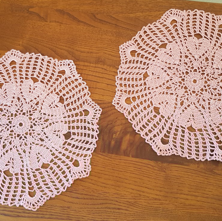 Lovely pair of doilies, table decorations or mats - in a vibrant coral pink - lovely hearts design
