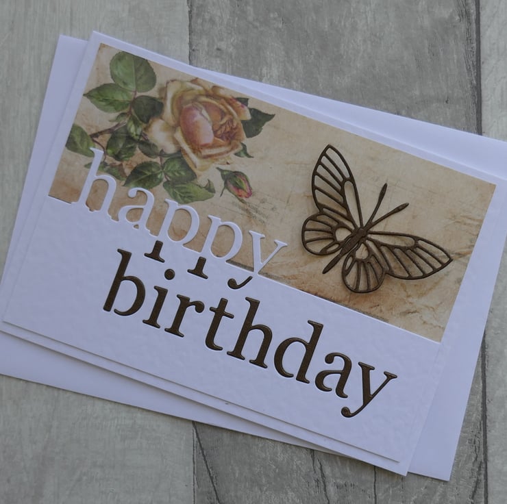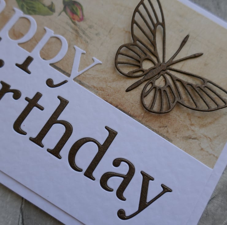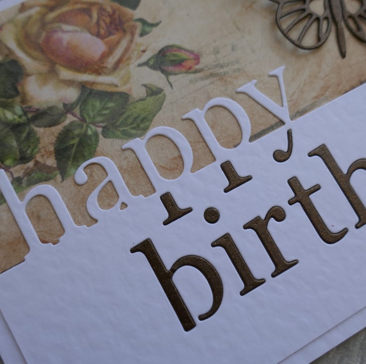 The front of the card is covered in a beautiful vintage look paper in muted brown tones with a peach rose at the top and a feint music pattern. The lower edge of the card has a die cut 'Happy Birthday' in white hammer card with the lower section inlaid in brown pearlescent card. The card is finished with a brown pearlescent die cut butterfly which is attached along its body so the wings can be shaped.