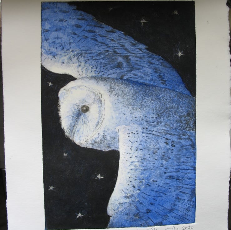 This lovely drypoint etching of a flying barn owl was created with a plexiglass plate using fine point tools and Akua soy based ink. It has been lovingly coloured by hand with watercolours. The printed area measures 4"x6", and is numbered (10 of an edition of only 20) and signed. Sold unmounted, as seen.