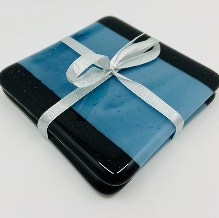 Two Fabulous Black and Streaky Blue Fused Glass Coasters.
