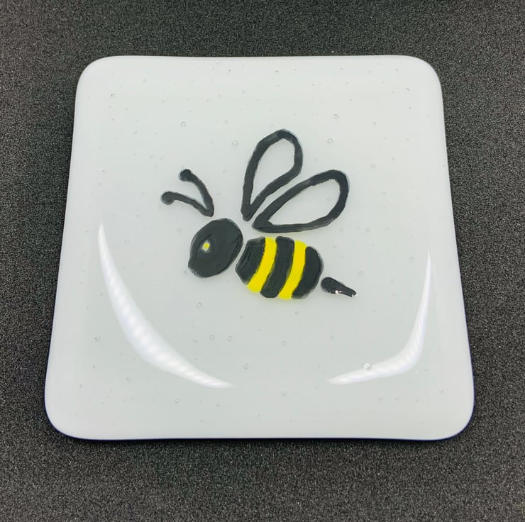 Fabulous White Fused Glass Coaster with cute hand painted bumble bee.