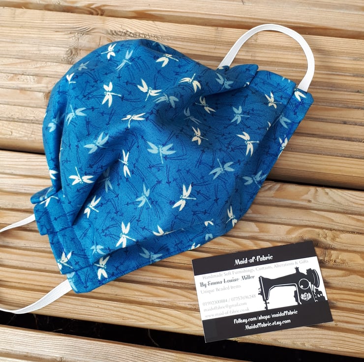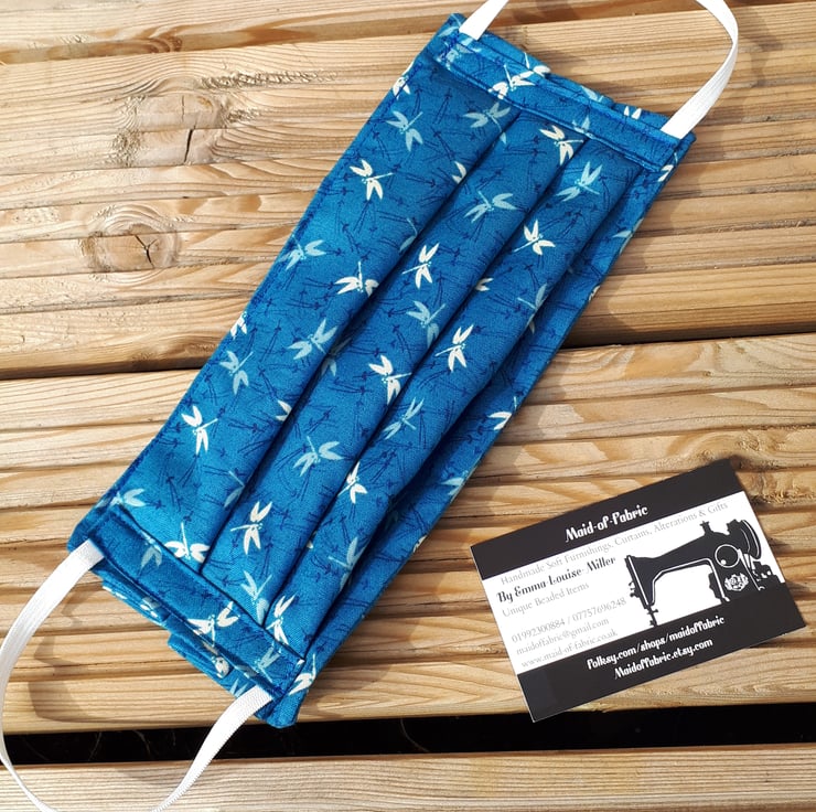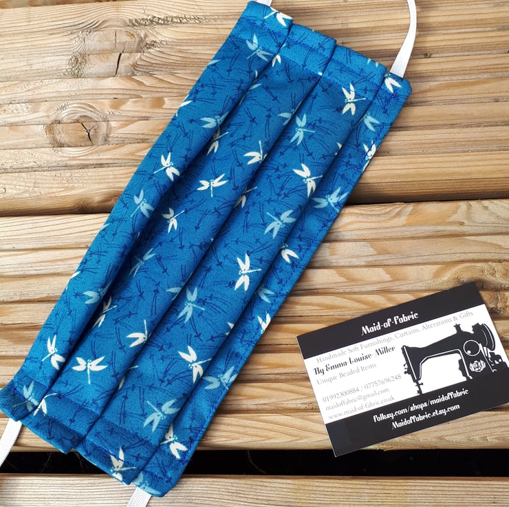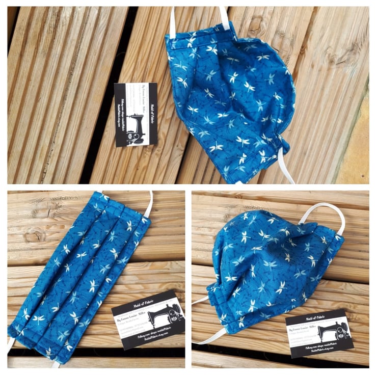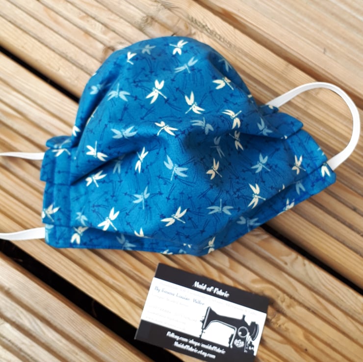Face mask made using blue Dragon fly cotton fabric and white elastic.