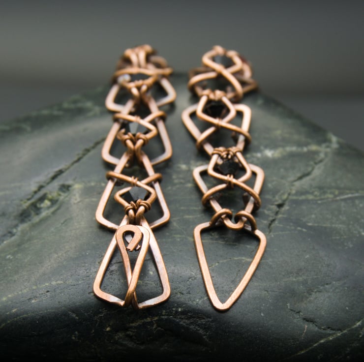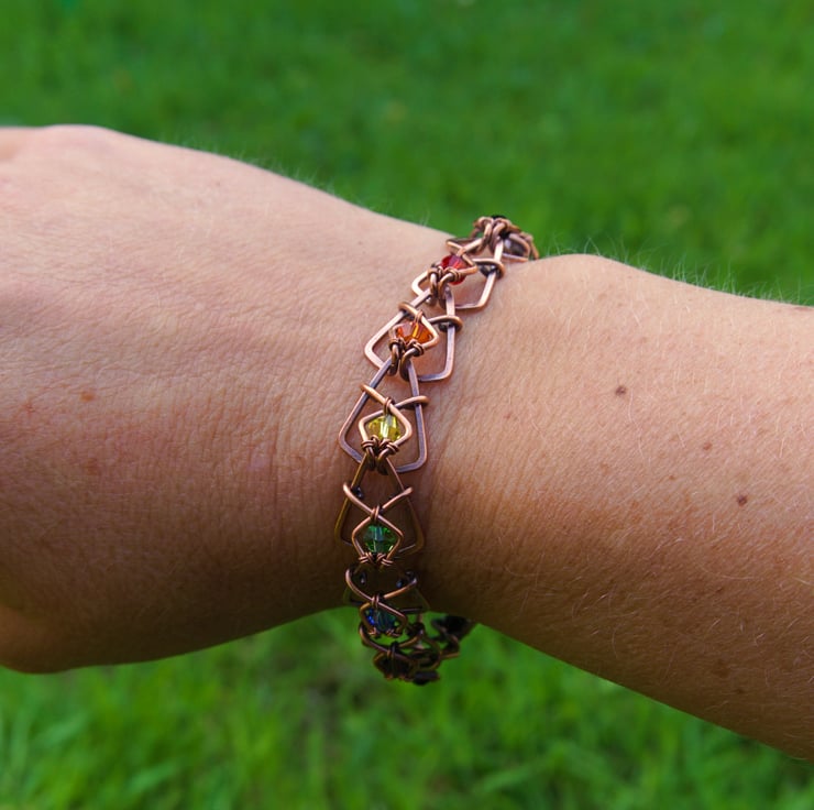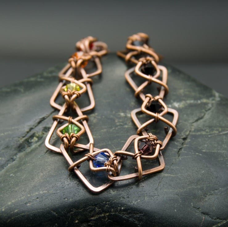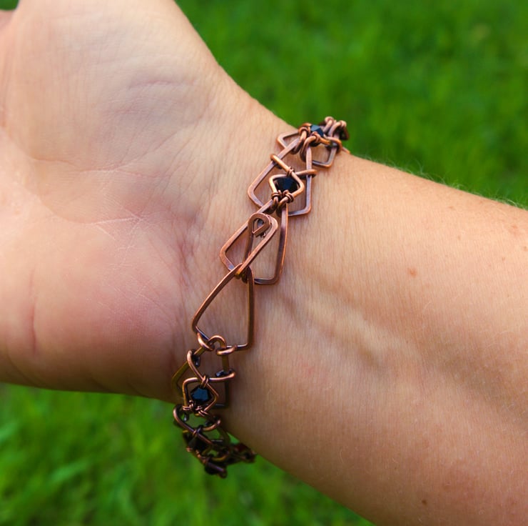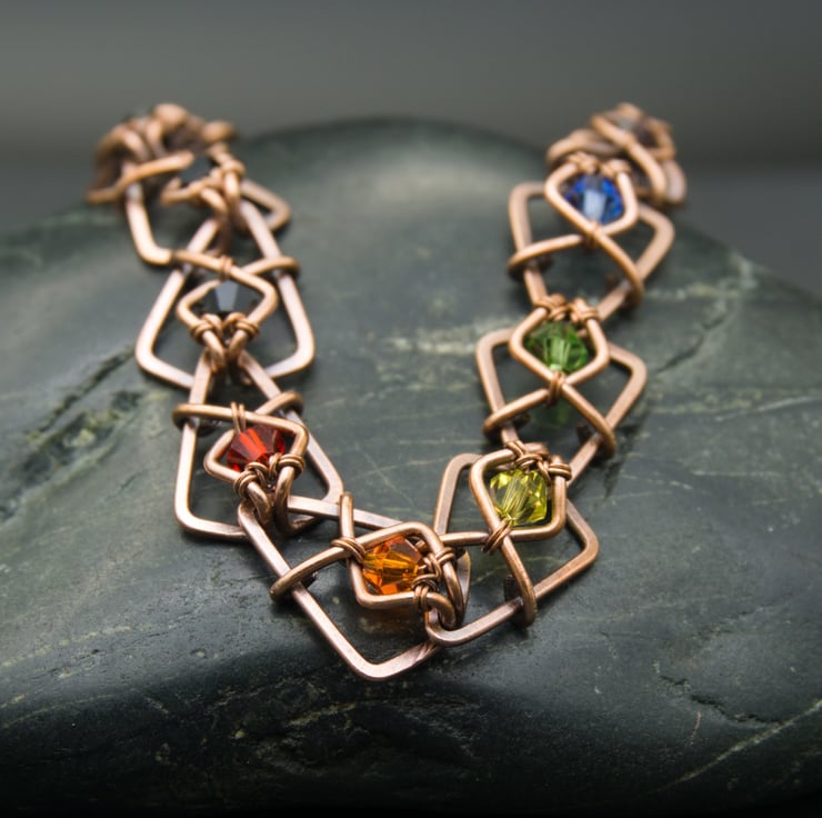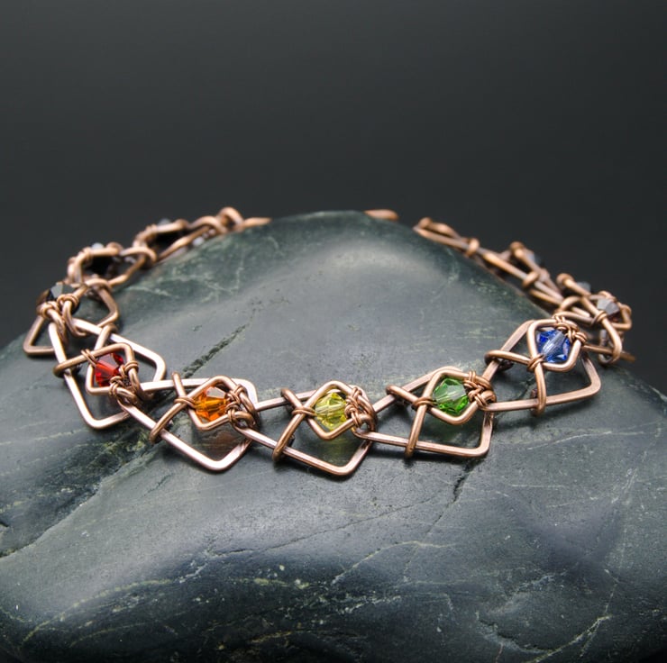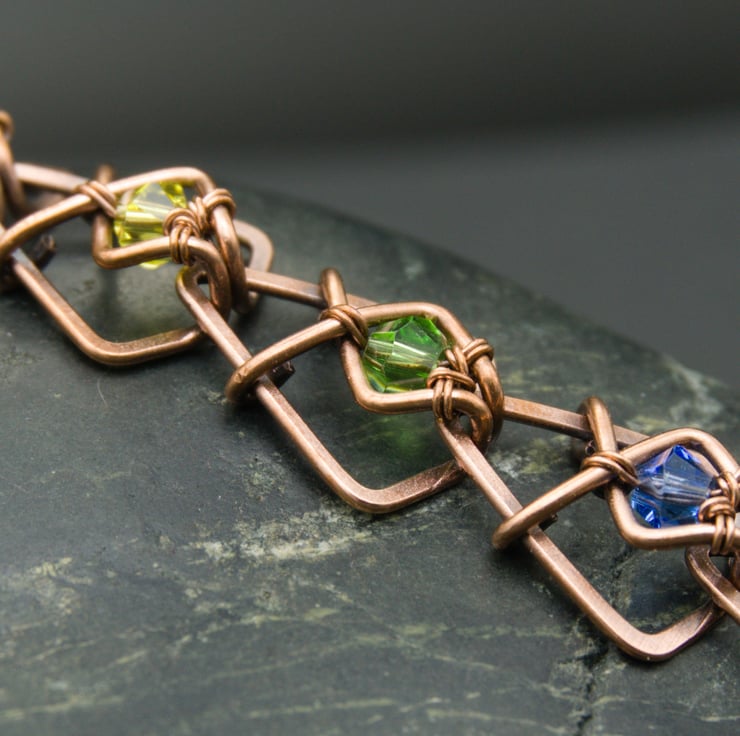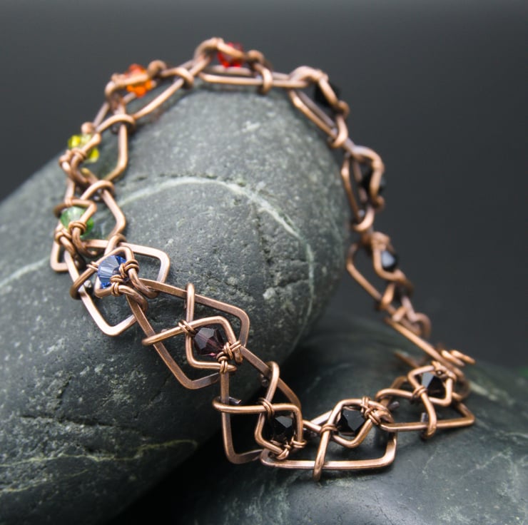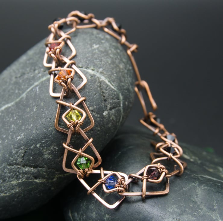 This unusual geometric bracelet has been handmade from lengths of copper wire. I've used 1mm thick wire to create arrowhead shapes, which have then been hammered flat. Each link has then been further shaped to add a diamond shaped frame - within each frame I've woven a 4mm faceted glass bicone bead. The beads are rainbow coloured across the front, with black beads either side. The links have then been joined together & a simple matching clasp added.