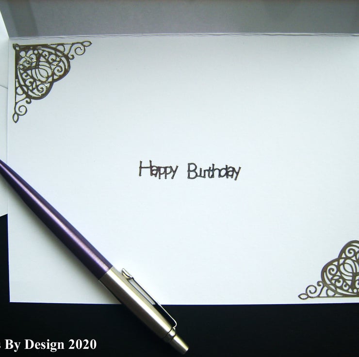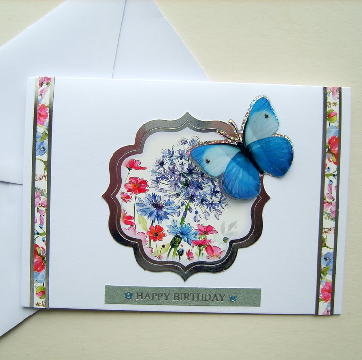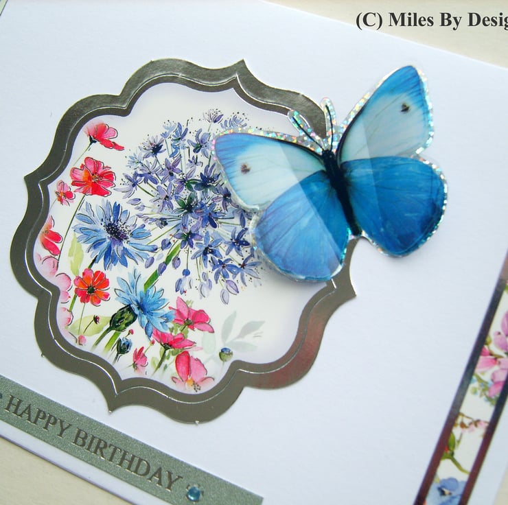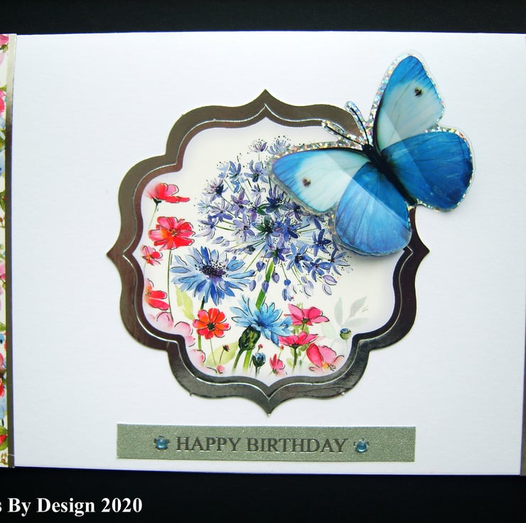 This pretty floral birthday card has a blue 3D shaped butterfly attached and inside is decorated with silver filigree corner details and wording.