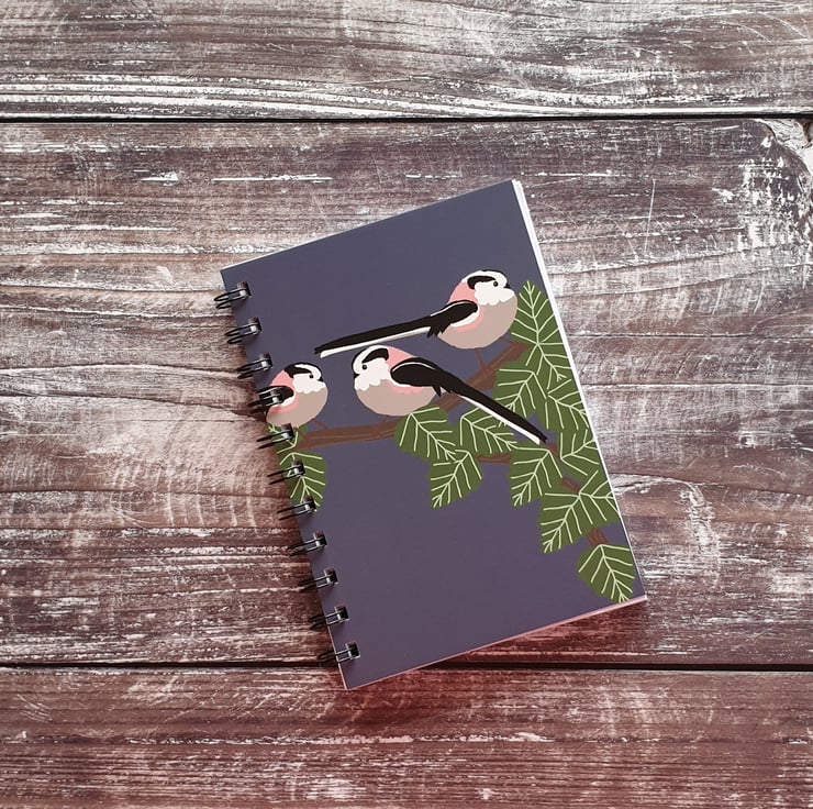 An A6 size notebook with a digital drawing of Long tailed tits designed in Shropshire by me and then printed in the UK on a luxury 330gsm card front cover.
