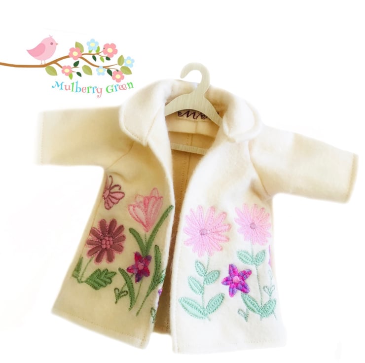 A gorgeous cream Edge to edge tailored coat to fit the Mulberry Green dolls. The coat is machine embroidered with pretty pink flowers. It comes on a little wooden hanger.