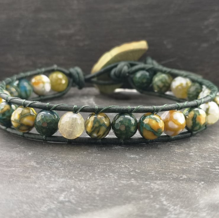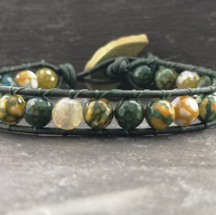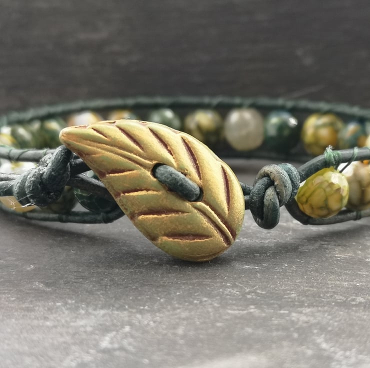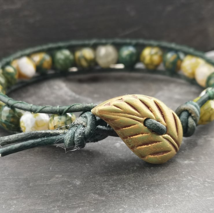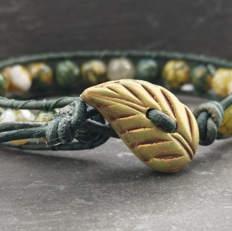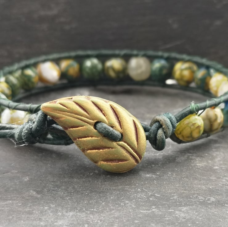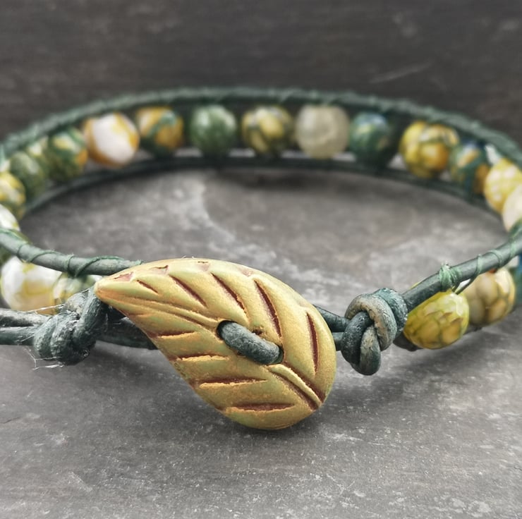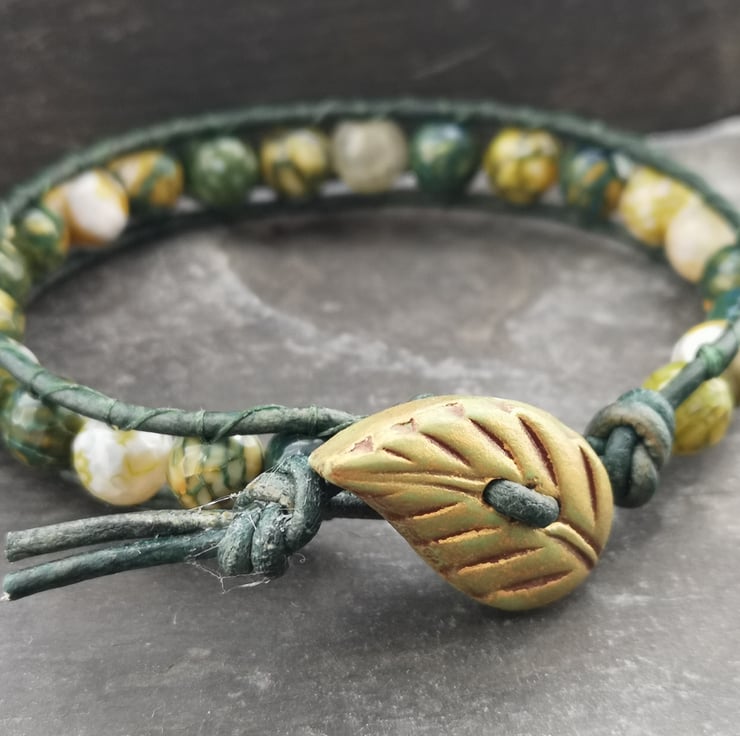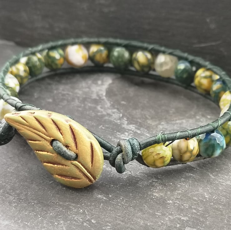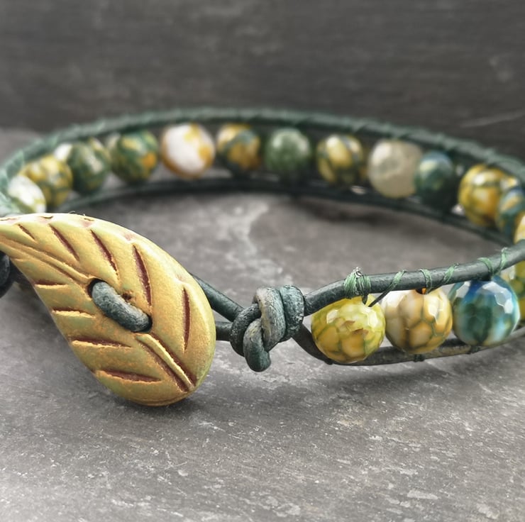 This bracelet has been made with soft leather cord in a rich shade of green. Stunning yellow green fire agate beads have been added and a leaf shaped button has been used as a fastener.