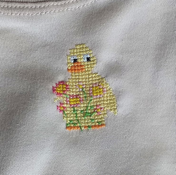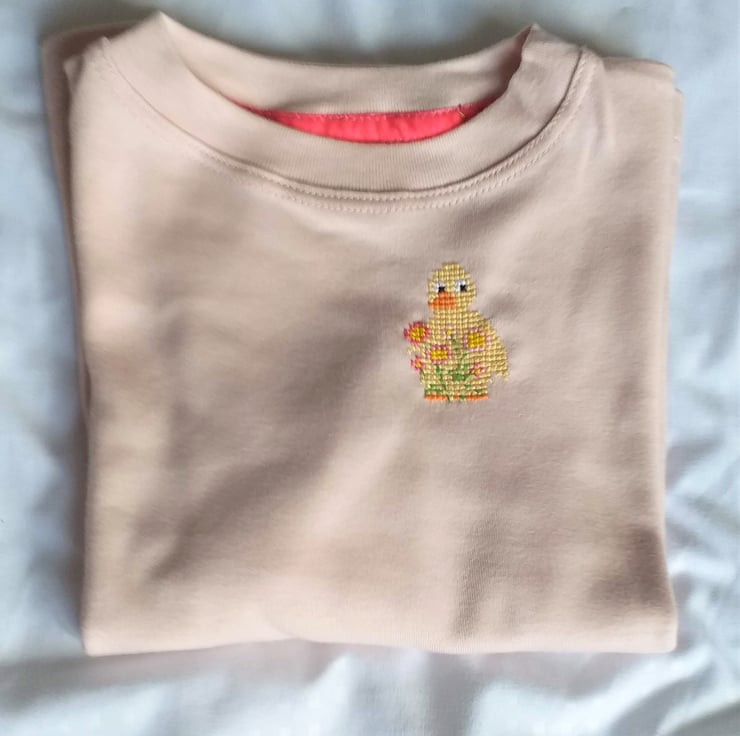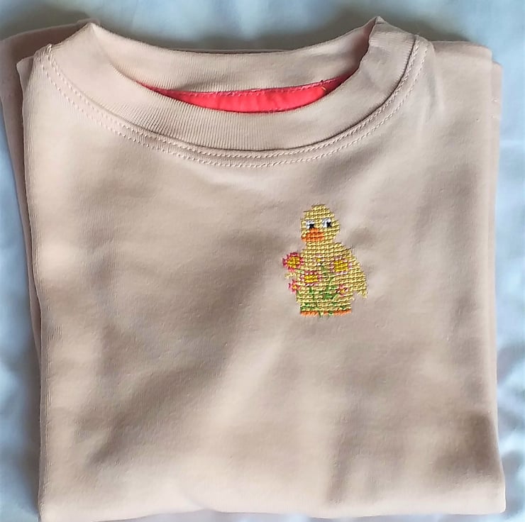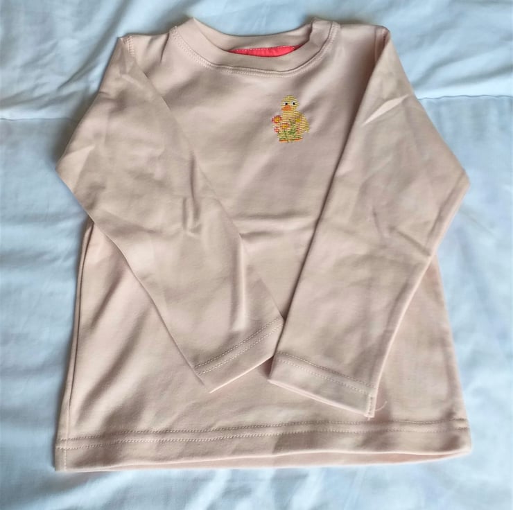 This is a lovely dusky pink, long sleeved T-shirt, for a 3 year old. On the left front I have hand embroidered a yellow duckling/chick standing and gazing wide-eyed at pink and golden flowers. As I never use a permanent backing material when hand embroidering kids' clothing, there is nothing inside to irritate your child's skin. The shirt has a soft velvet band inside the back of the neck. It is 100% cotton and machine washable.
