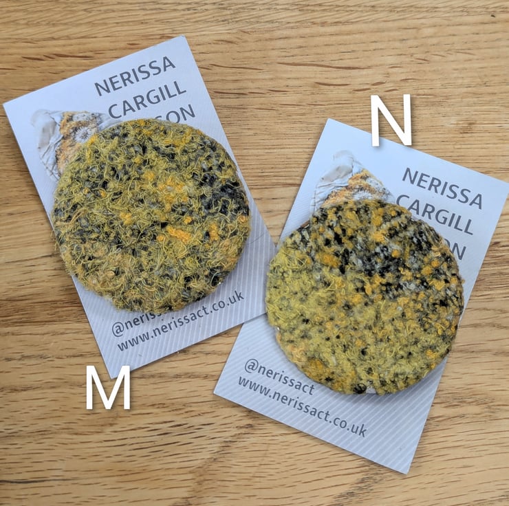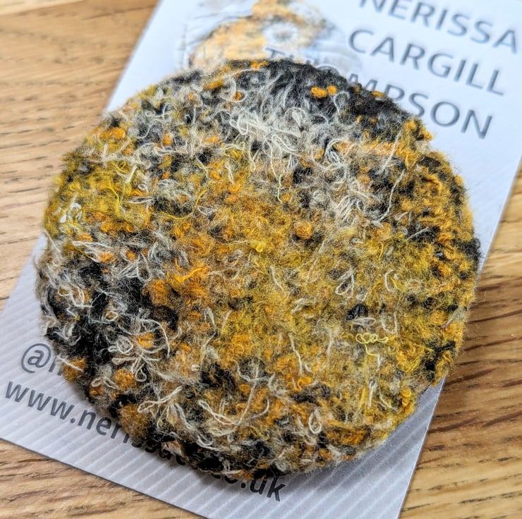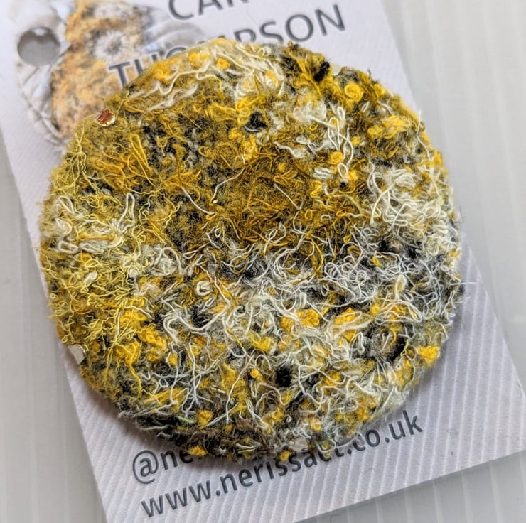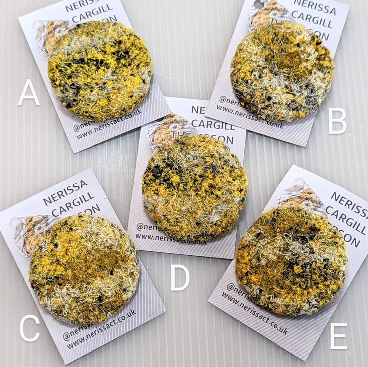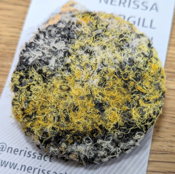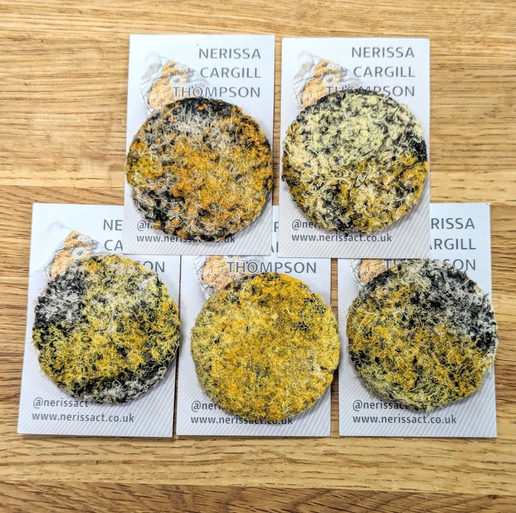 To limit my waste, I turn my colourful textile scraps into jewellery. The embellished textiles are mounted onto 50mm commercial brooch backs that have a standard rolling safety clasp.
