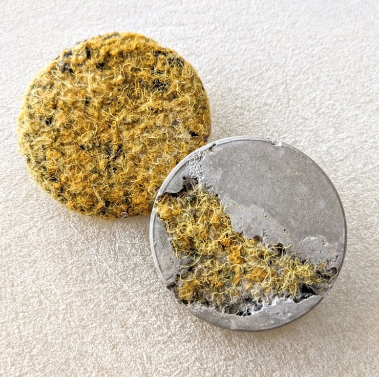 I create coastal inspired textures using a combination of embellishing and embroidery; blending a variety of recycled fabrics to create subtle variations in tone. These are stitched inside waste plastic to cast true to life pieces with cement giving a distinct contrast between the manmade structure of the packaging and the soft natural textures of the textiles.
